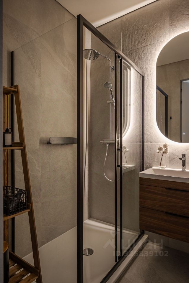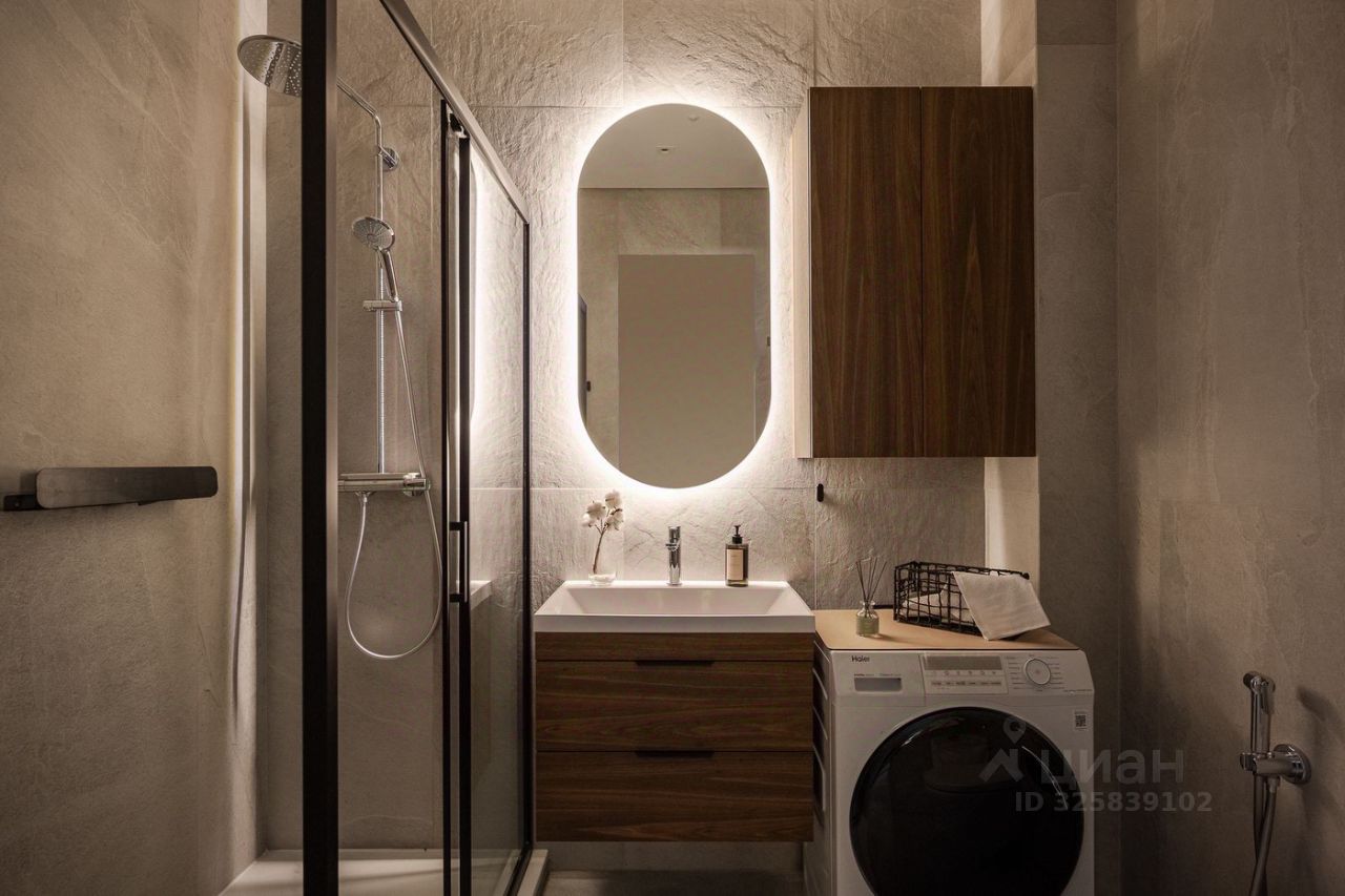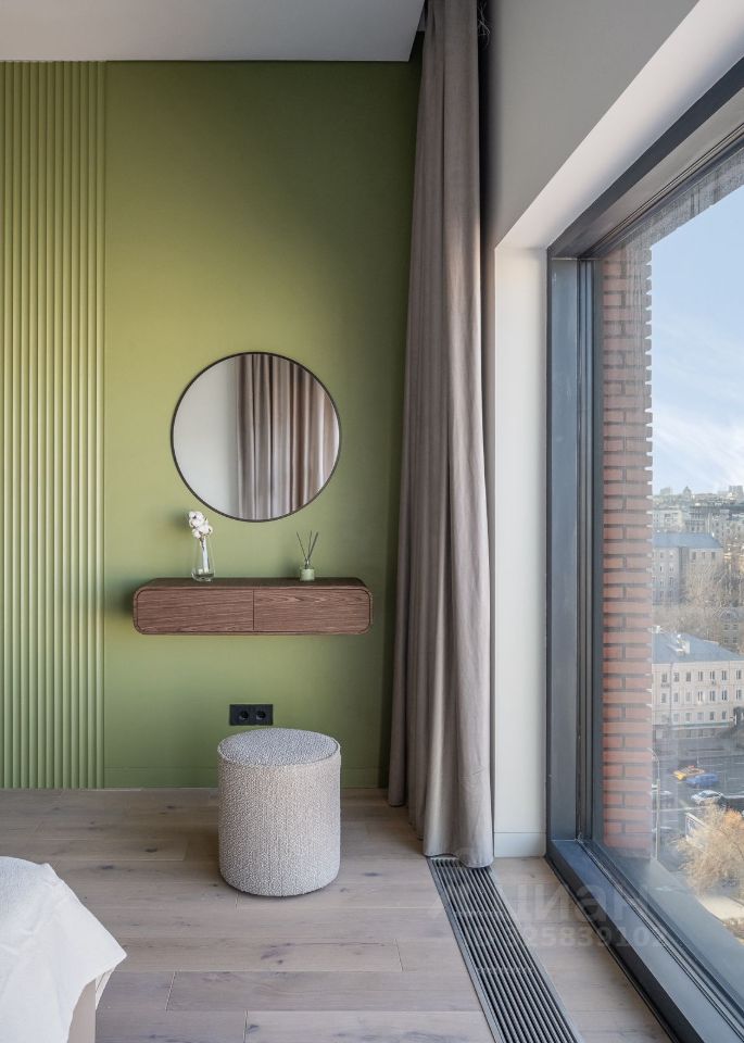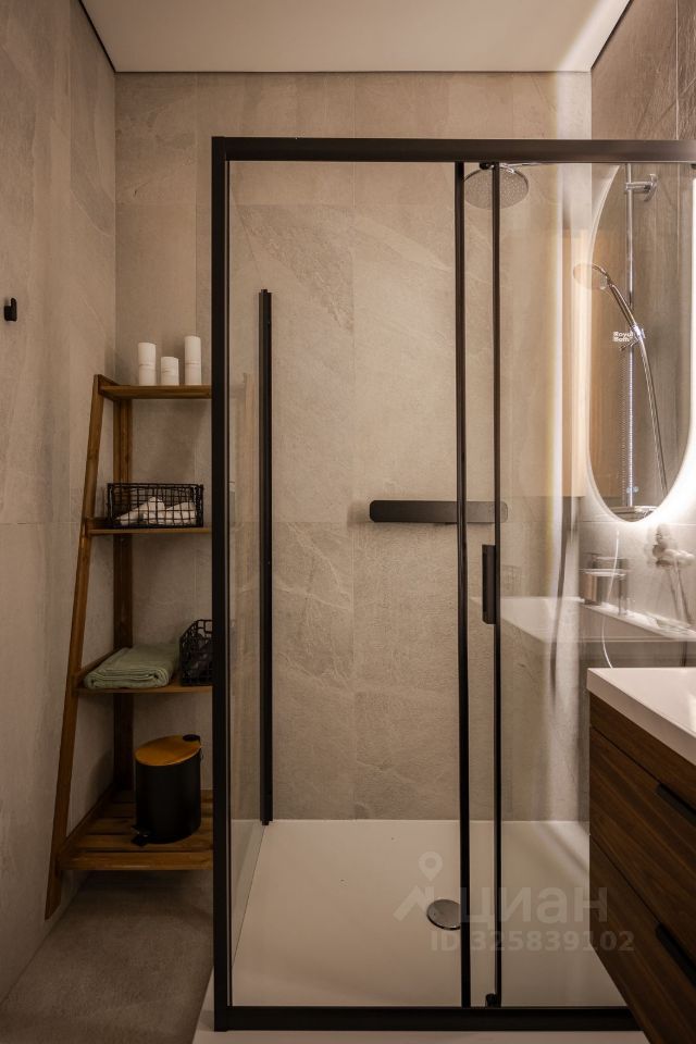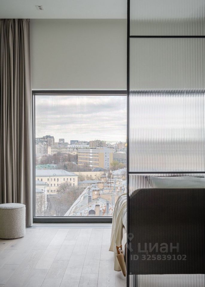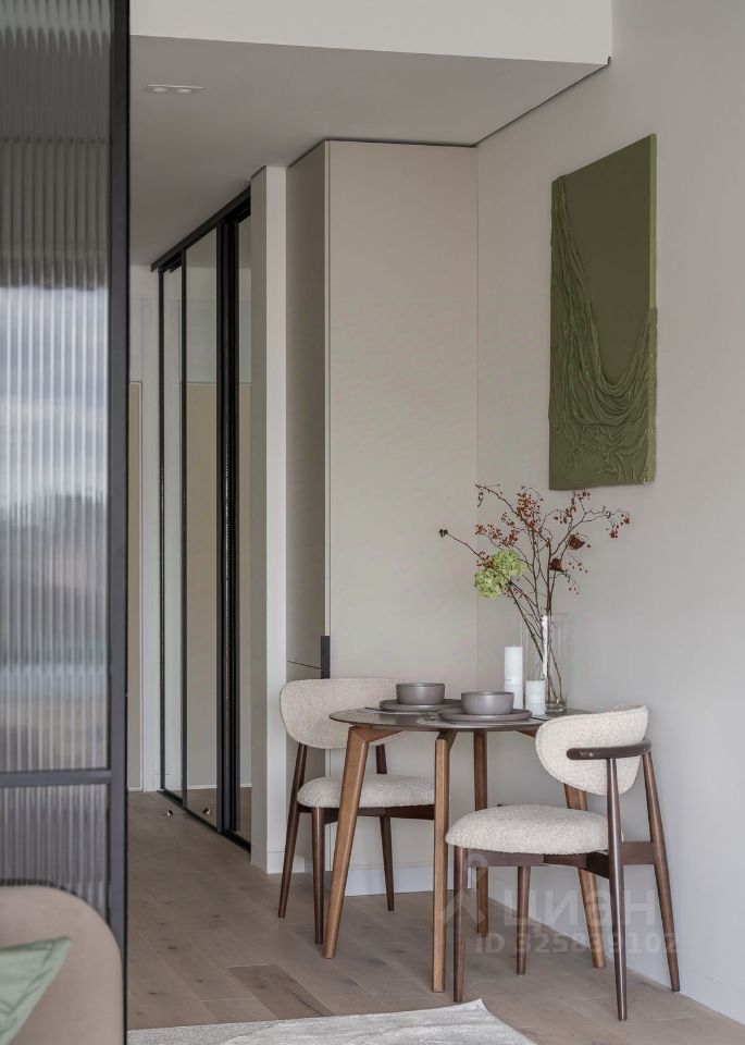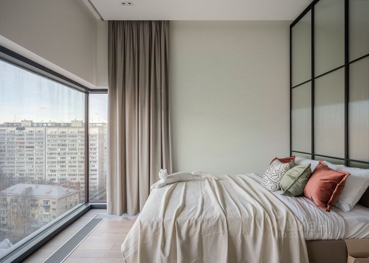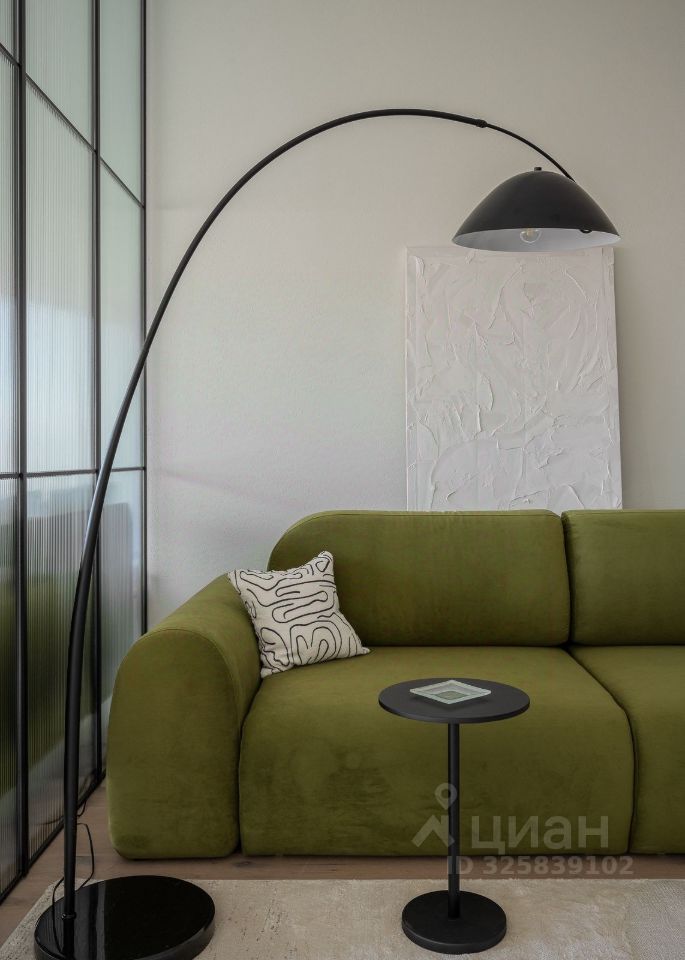 Стильная студия с продуманным дизайнерским интерьером. Пространство зонировано стеклянной перегородкой с рифлёным стеклом, что создаёт ощущение отдельной спальни при сохранении света и воздуха.