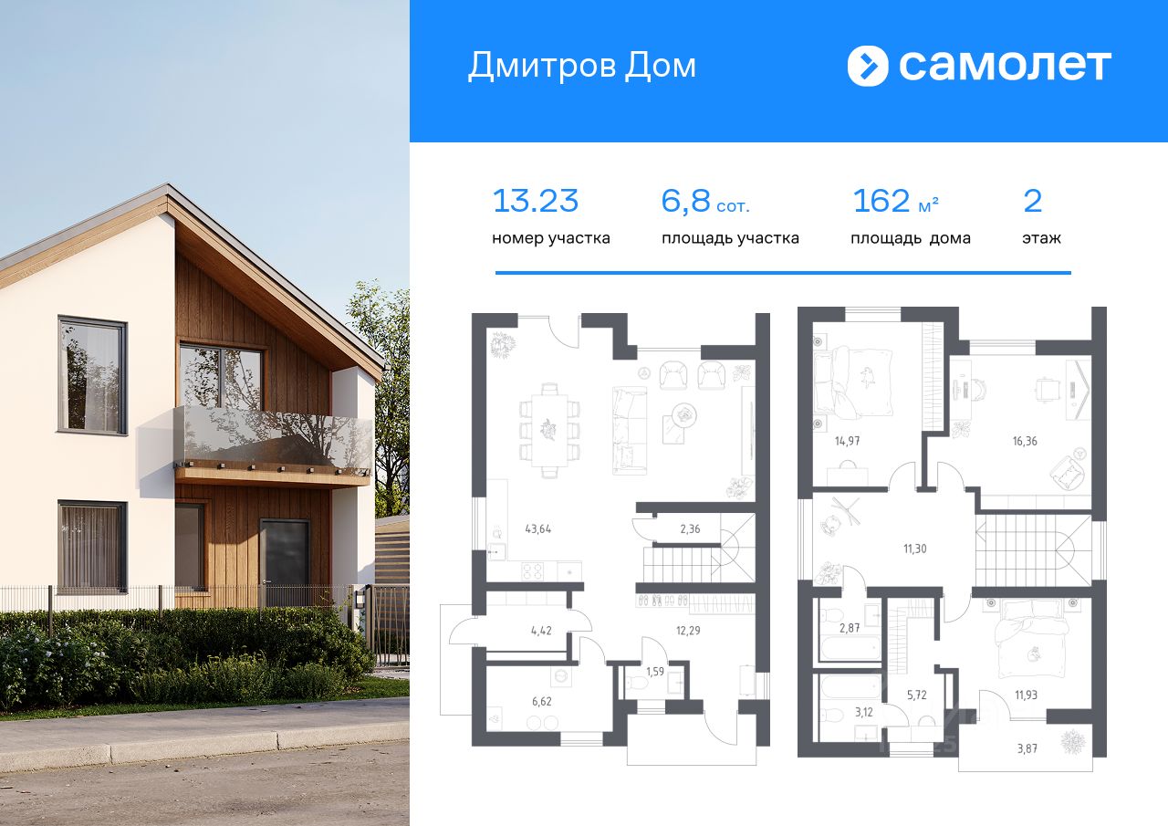В продаже дом площадью 161,95 м2 на участке 6.75 от застройщика ''Самолет'' в загородном проекте ''Дмитров Дом''. Функциональная планировка, большие окна и высокие потолки. Дом без отделки.
