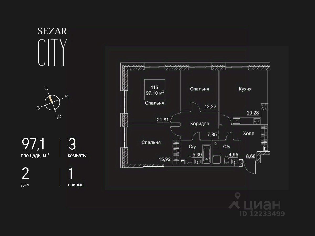 Продается 3-комнатная квартира в ЖК SEZAR CITY на 12 этаже. Общая площадь квартиры составляет 97,1 кв.м. Квартира без отделки. Срок сдачи - 2027 год.