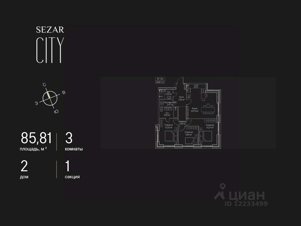 Продается 3-комнатная квартира в ЖК SEZAR CITY на 12 этаже. Общая площадь квартиры составляет 85,81 кв.м. Квартира без отделки. Срок сдачи - 2027 год.
