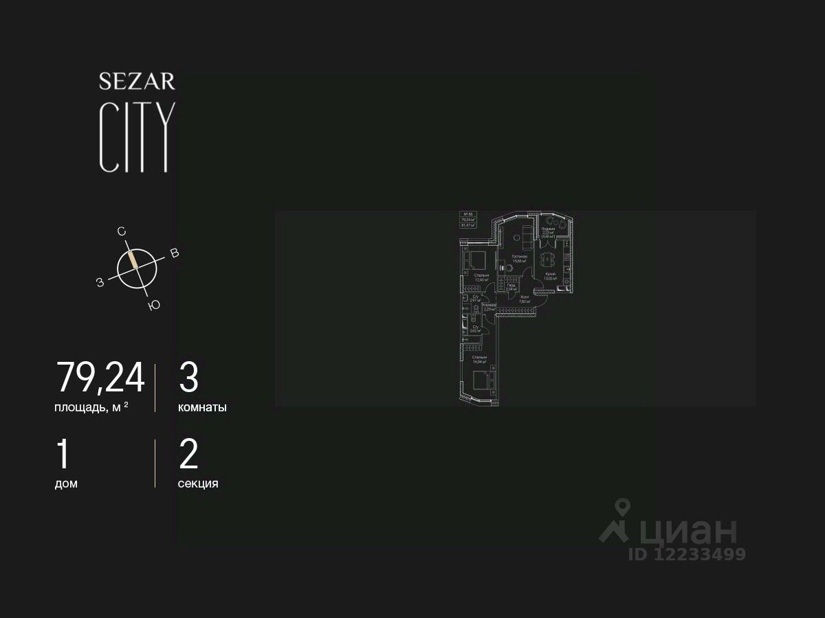 Продается 3-комнатная квартира в ЖК SEZAR CITY на 10 этаже. Общая площадь квартиры составляет 79,24 кв.м. Квартира без отделки. Срок сдачи - 2027 год.