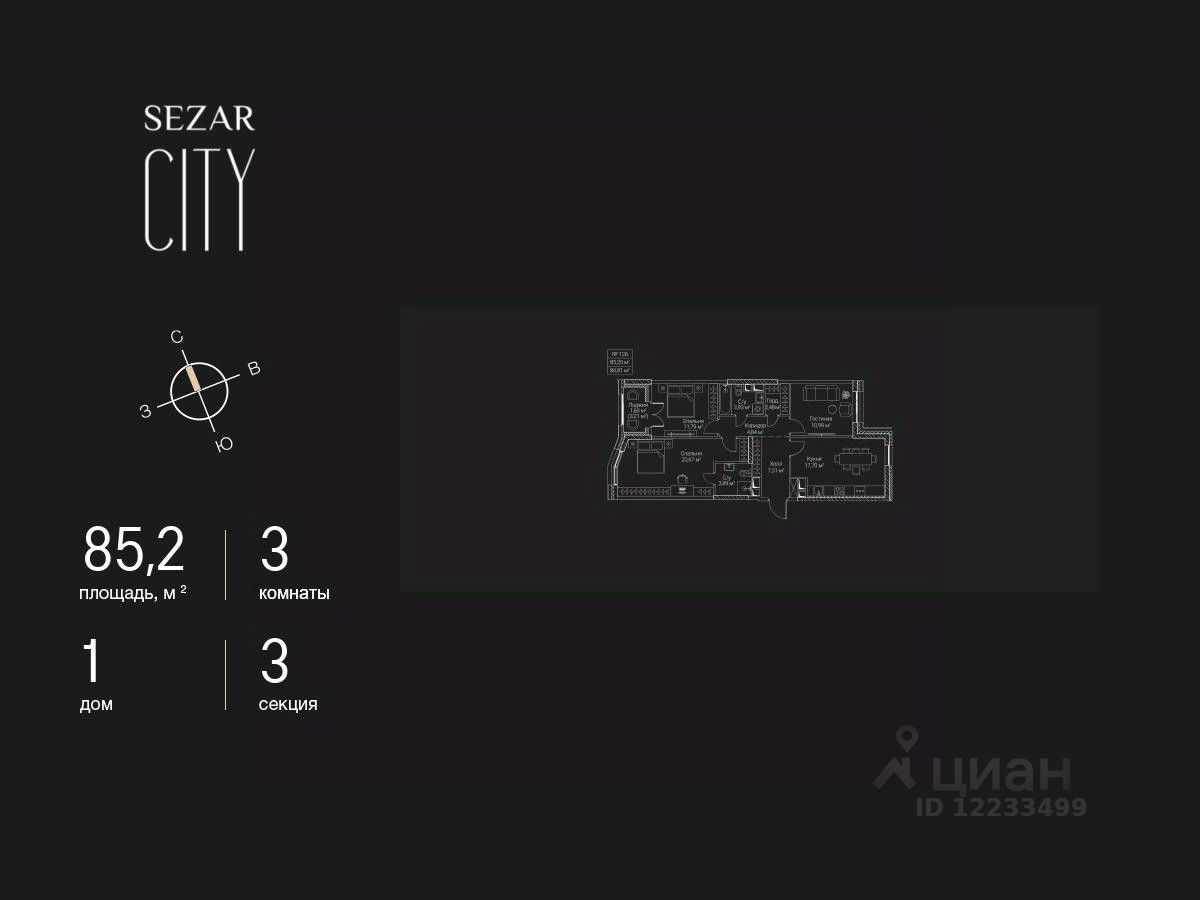 Продается 3-комнатная квартира в ЖК SEZAR CITY на 5 этаже. Общая площадь квартиры составляет 85,2 кв.м. Квартира без отделки. Срок сдачи - 2027 год.