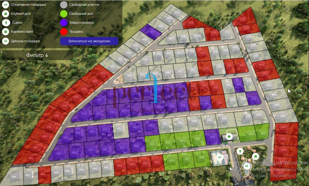 Большая парковая зона внутри поселка, детская площадка с огромной игровой зоной, качелями, батутом и песочницей.
