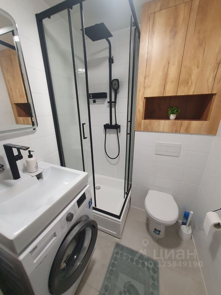 Санузел совмещенный, оснащен душевой кабиной и стиральной машиной. В квартире установлен кондиционер для комфортного проживания в любое время года.