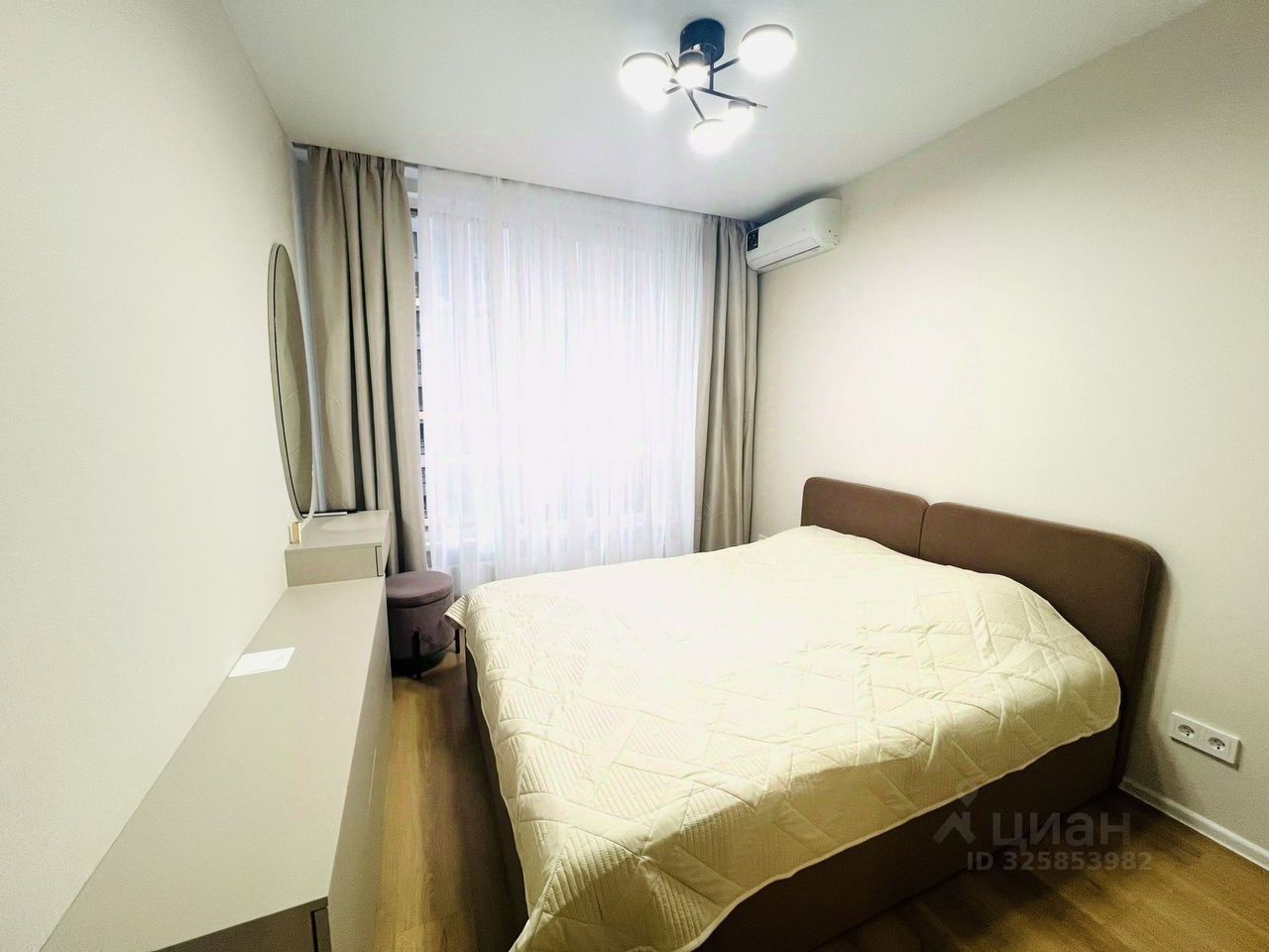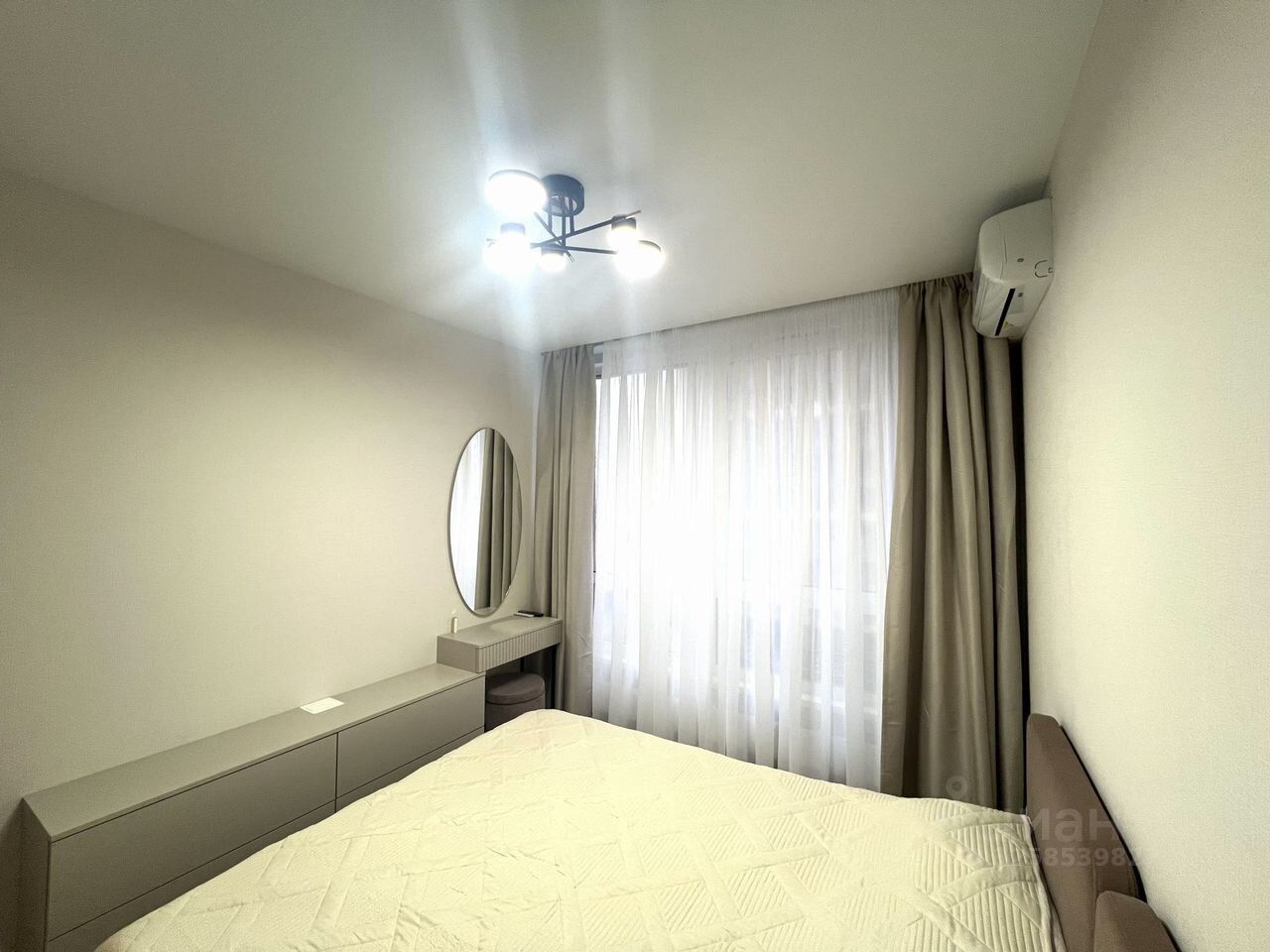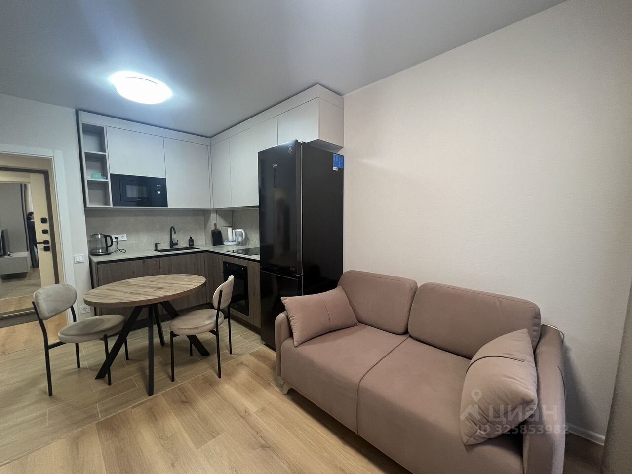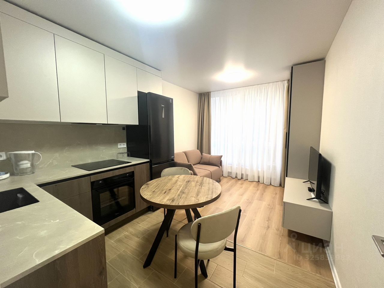 В квартире новый ремонт. Просторная кухня площадью оснащена всей необходимой бытовой техникой, включая холодильник и микроволновую печь. В гостиной установлен кондиционер и телевизор, а также удобный диван и обеденный стол.