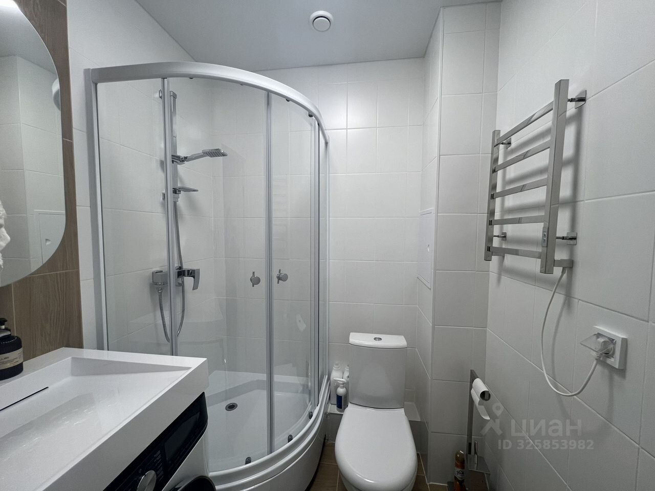 Совмещенный санузел оборудован душевой кабиной и стиральной машиной.