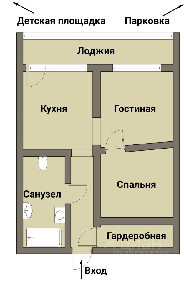 Планировка: Спальня, Гостиная, Кухня, Совмещенный санузел, Гардеробная, Прихожая, Лоджия.