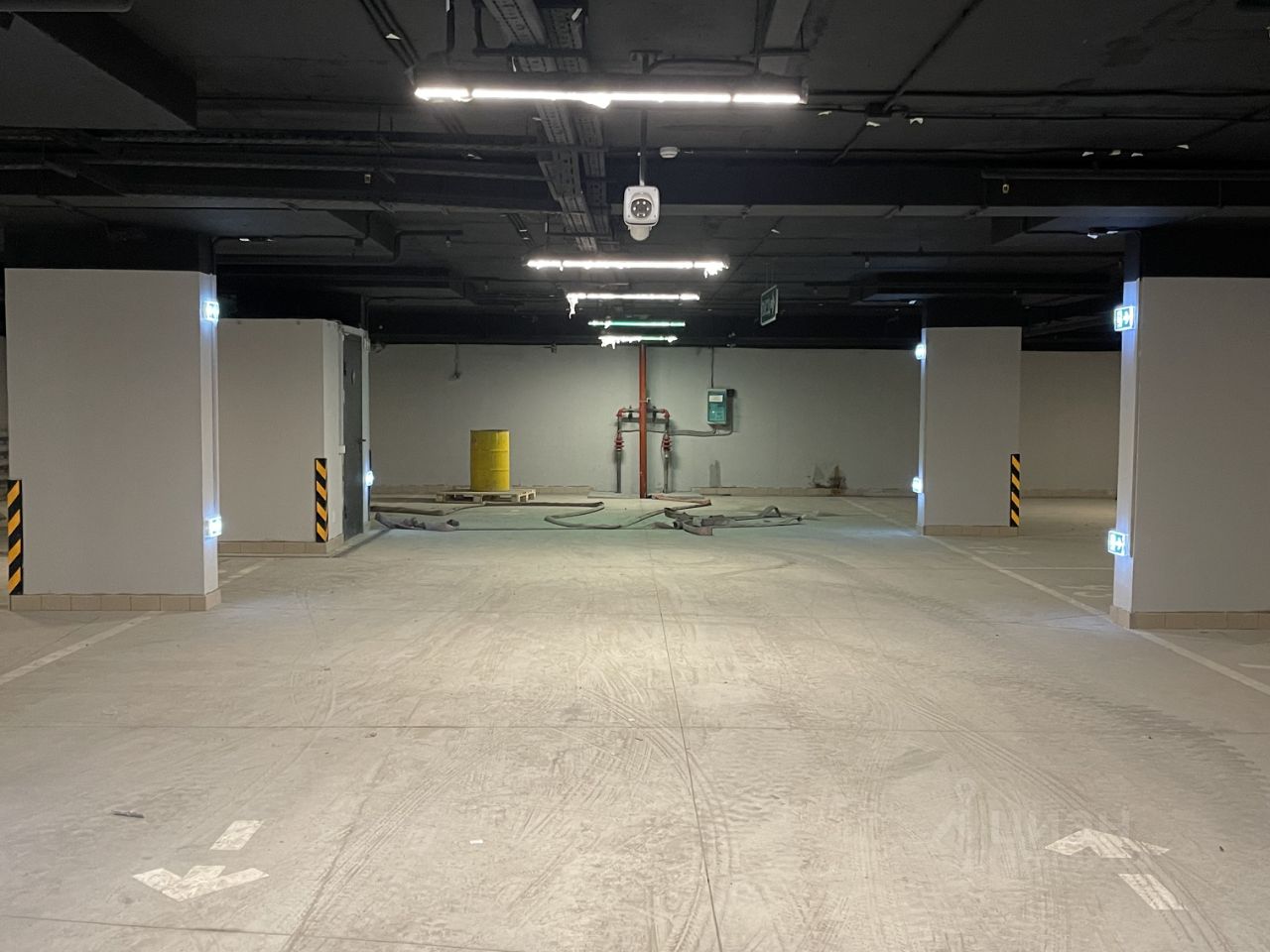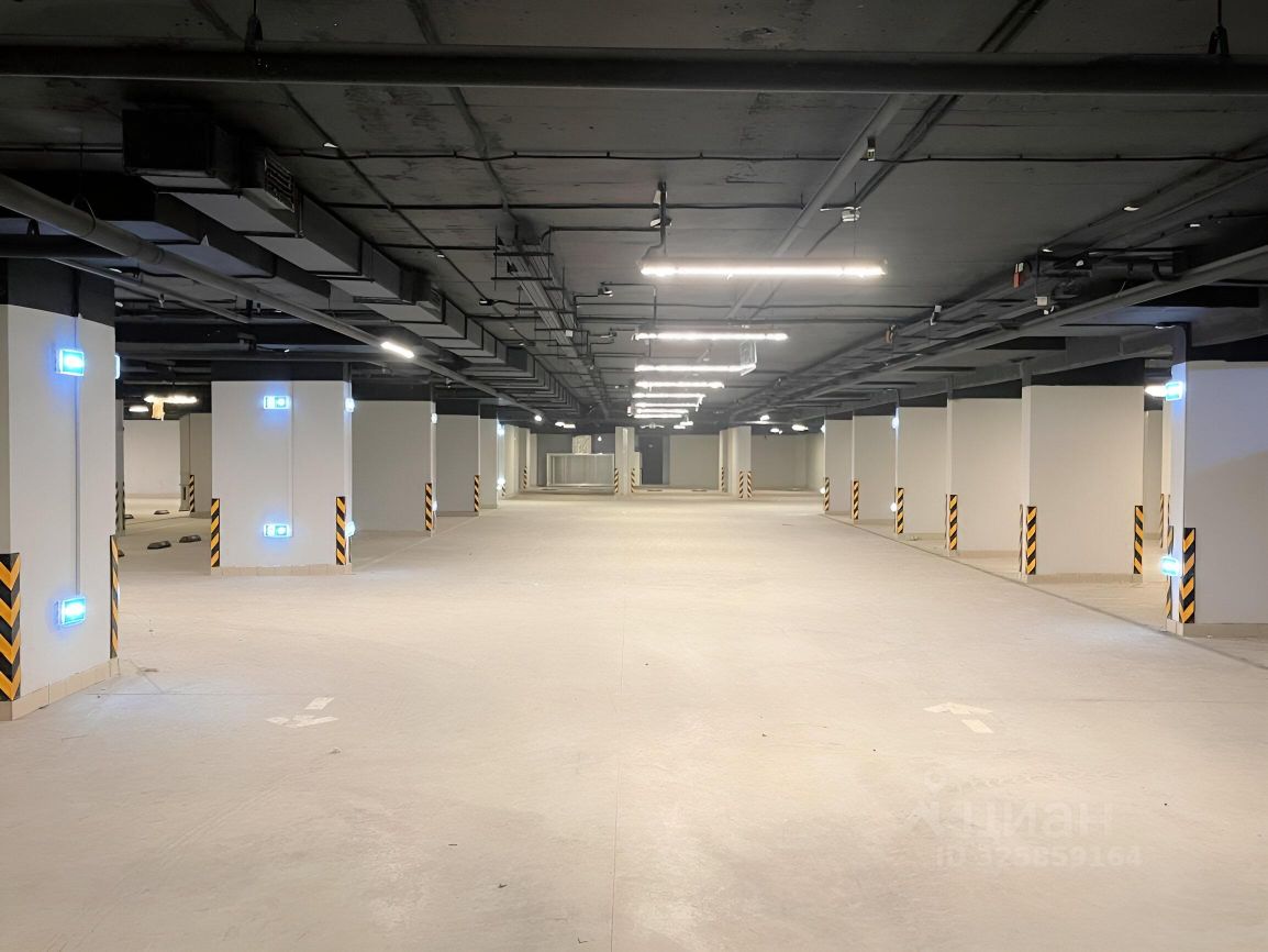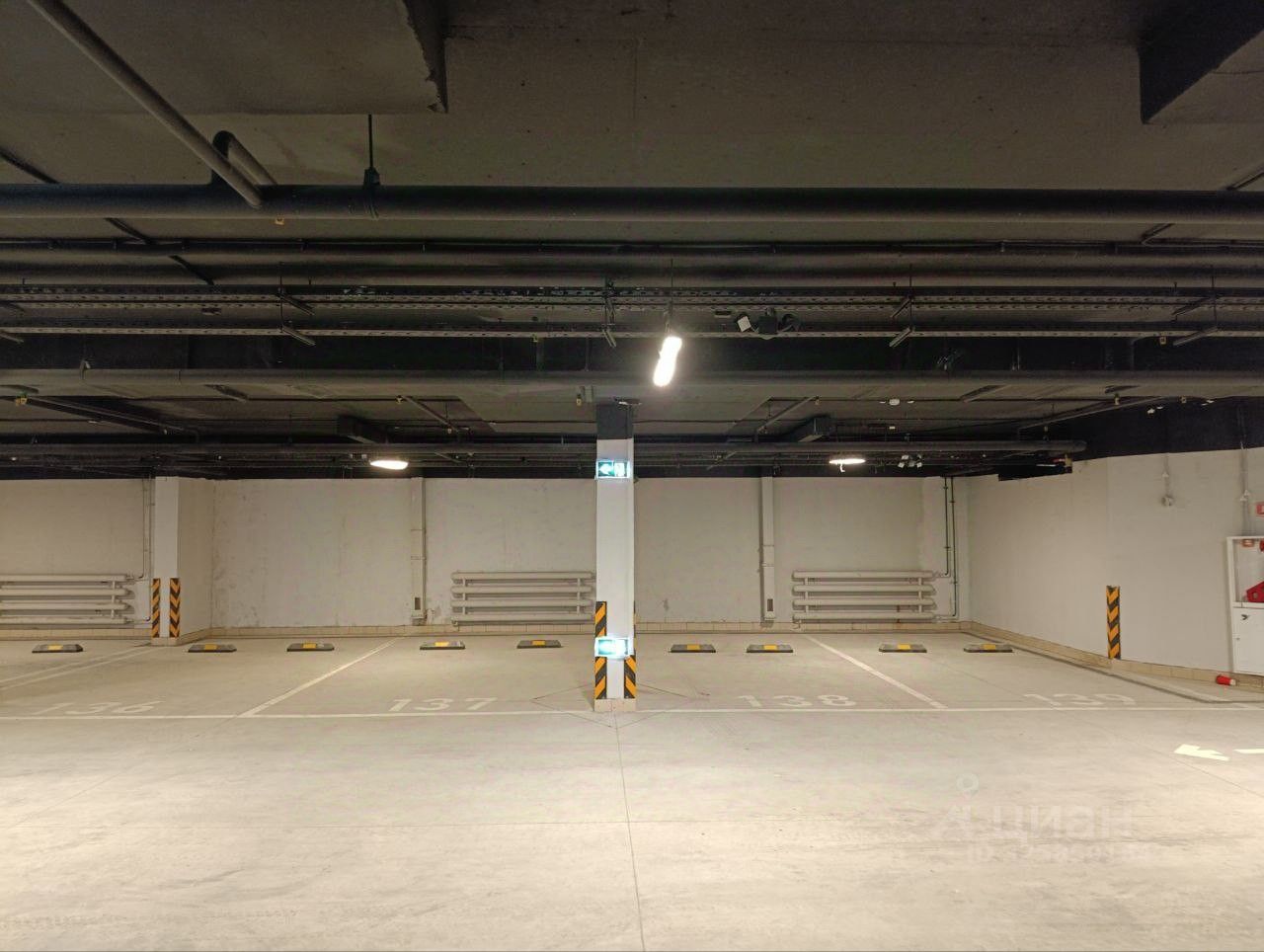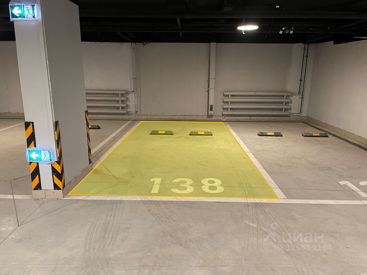 Место у стены, огорожено колонной, хорошо освещено. Место сухое, отсутствуют подтеки/влажности, минимум коммуникаций над машиноместом. Слева от машины есть доп. место для открытия двери (машиноместа не впритык).
