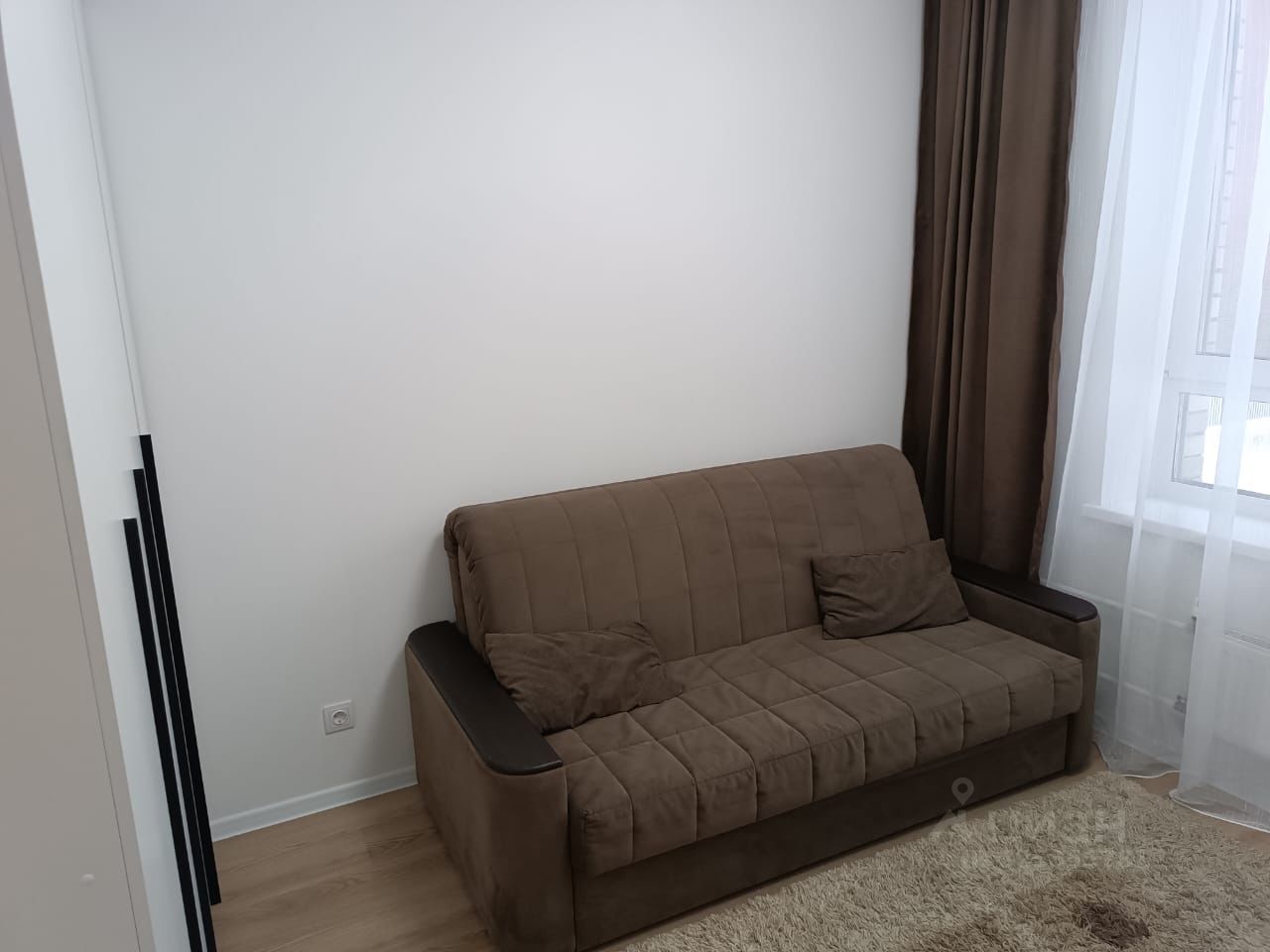 В комнате установлен вместительный шкаф и удобный диван. Санузел совмещенный, выполнен в светлых тонах и оснащен всем необходимым. В прихожей предусмотрены удобные полки для хранения верхней одежды и обуви.