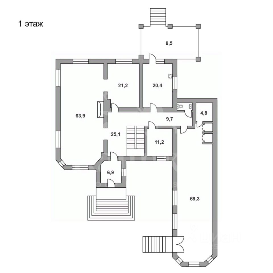 Дом представляет собой капитальное строение (монолит-кирпич) с толщиной наружных стен 60 см и высотой потолков от 3,5 до 5 м. В доме 4 уровня - три этажа и цокольное помещение.