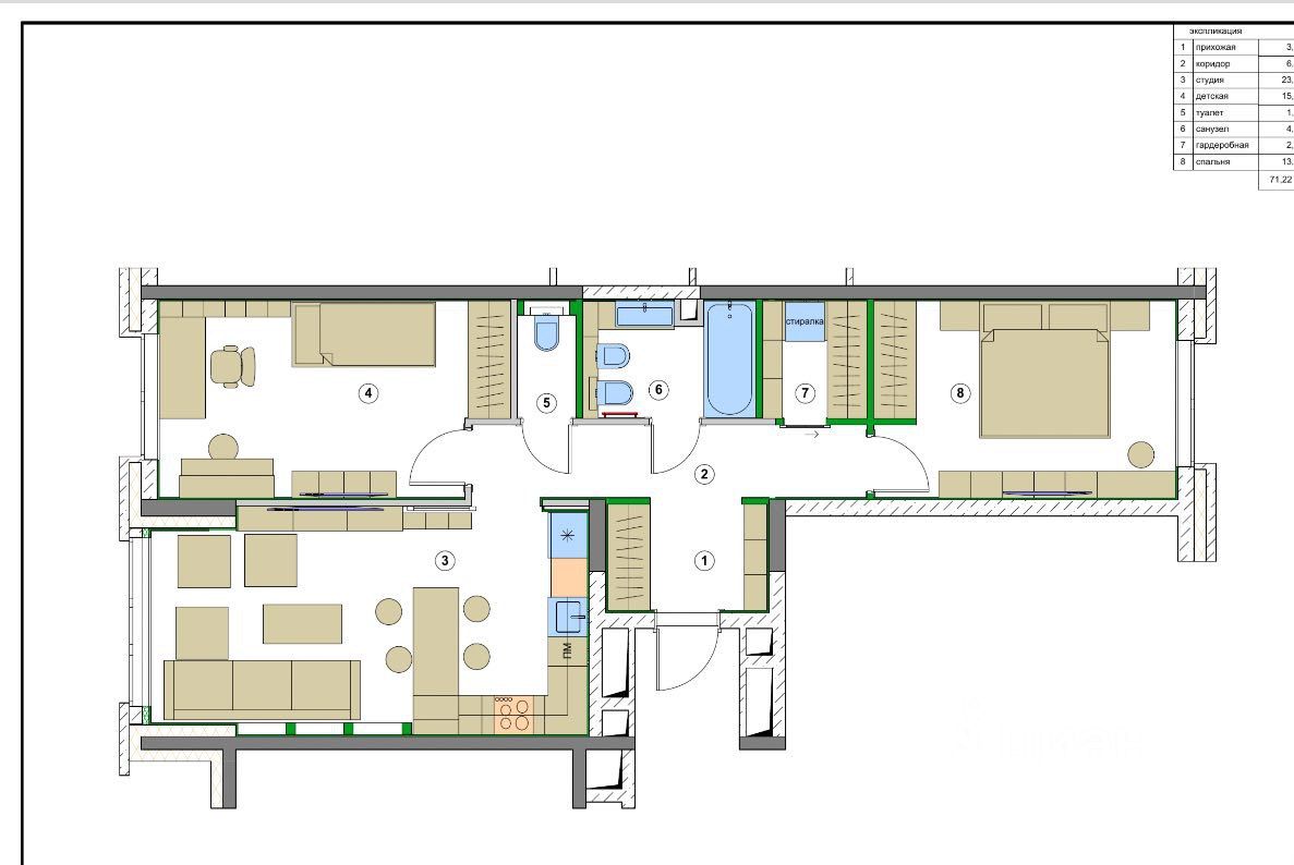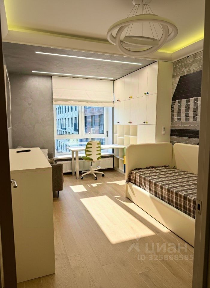 Планировка: * Кухня-гостиная: Просторная зона с современным дизайном, полностью укомплектована техникой. * Спальня: Уютная комната для отдыха, оснащённая вместительным встроенным шкафом. * Детская: Отдельная комната, которая может быть использована как детская или кабинет.