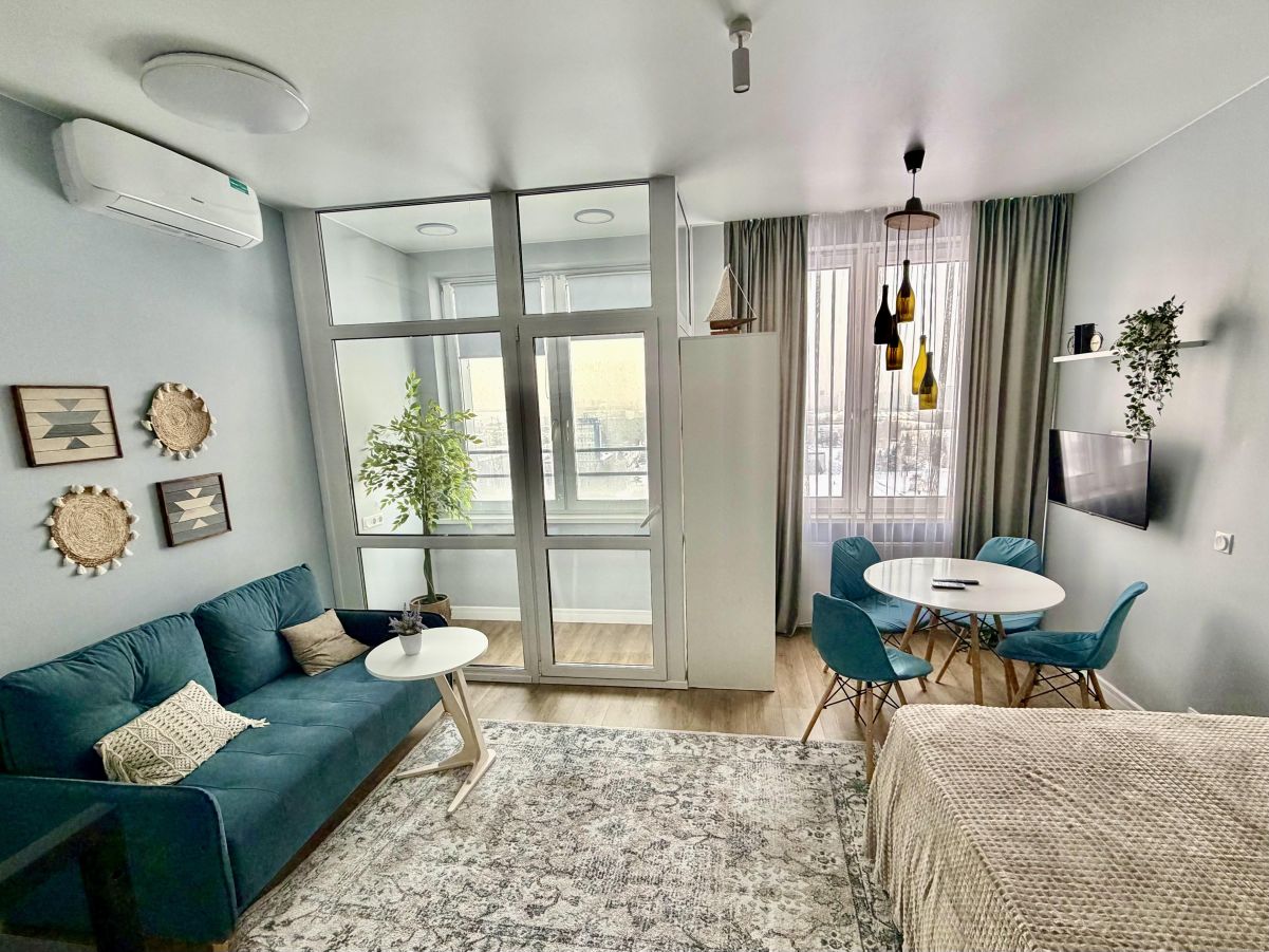 -продуманная до мелочей концепция пространства, -места для хранения: 2 больших шкафа и пространство под кроватью, -спальные места: удобная кровать и раскладывающийся диван, -полностью оборудованная кухня: вытяжка, микроволновая печь, холодильник, -уютная зона для чаепития с великолепным видом из окна — одинаково завораживающим днём и ночью, -просторная лоджия, где можно комфортно работать.