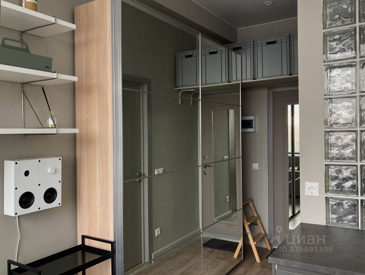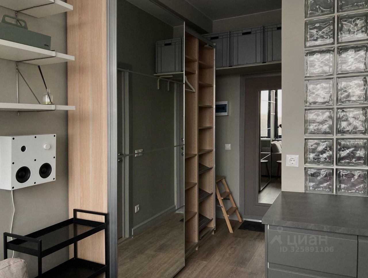 В аппартаменте система хранения состоит из зеркального шкафа, и небольшой антерсоли с 3 ящиками в прихожей. Спальное место -- икеевский удобный диван. Есть функциональное кресло из дерева, которое изменяется под небольшой столик для работы. Настенная саунд-система для прослушивания музыки.