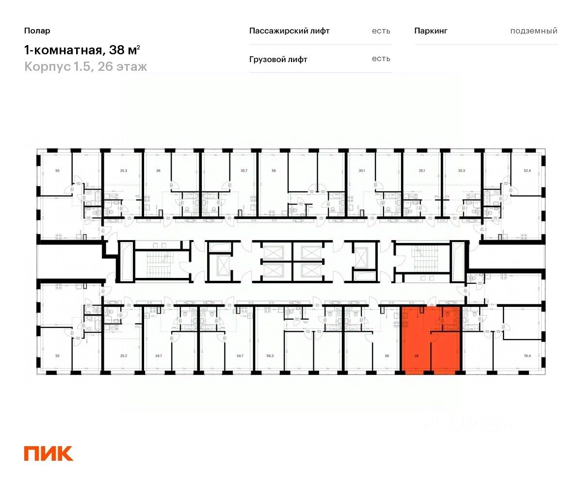 Продаётся 1-комн. квартира площадью 38 кв.м на 26 этаже 50 этажного дома (Корпус 1.5, Секция 2) проекта ПИК Полар. Светлый просторный подъезд на уровне земли, функциональная планировка, большие окна, предчистовая отделка.