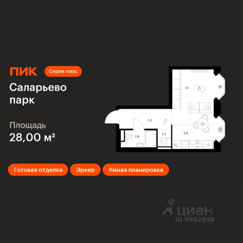 Продаётся квартира-студия площадью 28 кв.м на 15 этаже 24 этажного дома (Корпус 82.8, Секция 8) проекта ПИК Саларьево парк. Светлый просторный подъезд на уровне земли, функциональная планировка, большие окна, c отделкой.