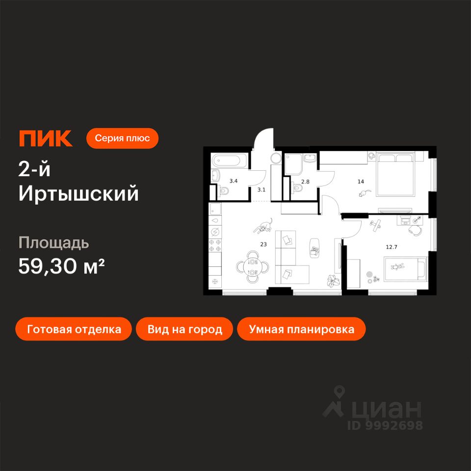 Продаётся 2-комн. квартира площадью 59,3 кв.м на 25 этаже 43 этажного дома (Корпус 1.1, Секция 1) проекта ПИК 2-й Иртышский. Светлый просторный подъезд на уровне земли, функциональная планировка, большие окна, c отделкой.