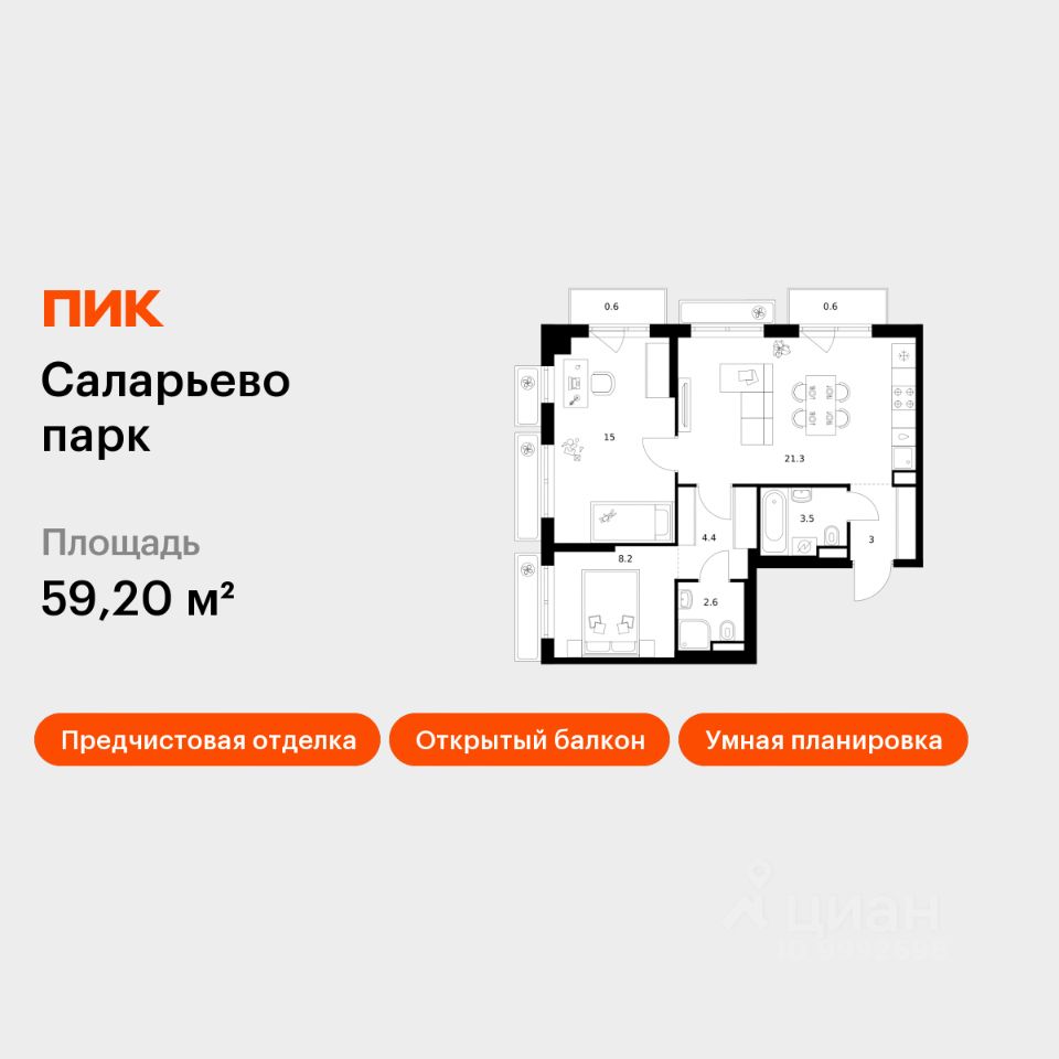 Продаётся 2-комн. квартира площадью 59,2 кв.м на 3 этаже 15 этажного дома (Корпус 57.2, Секция 2) проекта ПИК Саларьево парк. Светлый просторный подъезд на уровне земли, функциональная планировка, большие окна, предчистовая отделка.