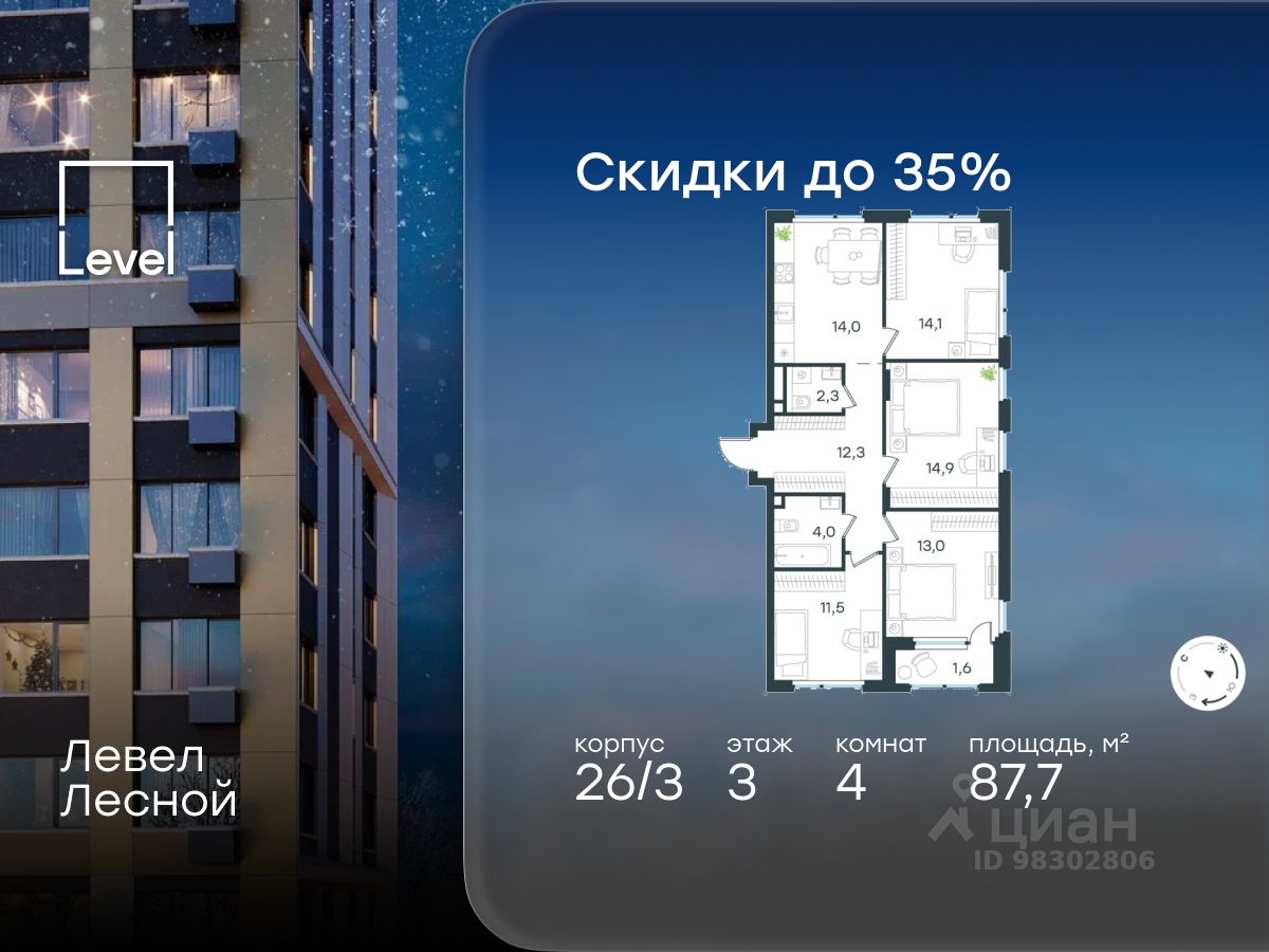 В районе, утопающем в густой зелени лесов, многочисленных парков и скверов, продаётся 4-комнатная квартира площадью 87.70 кв.м без отделки. Квартира расположена на 3 этаже в жилом комплексе комфорт-класса Левел Лесной (компания Level Group/Левел групп).