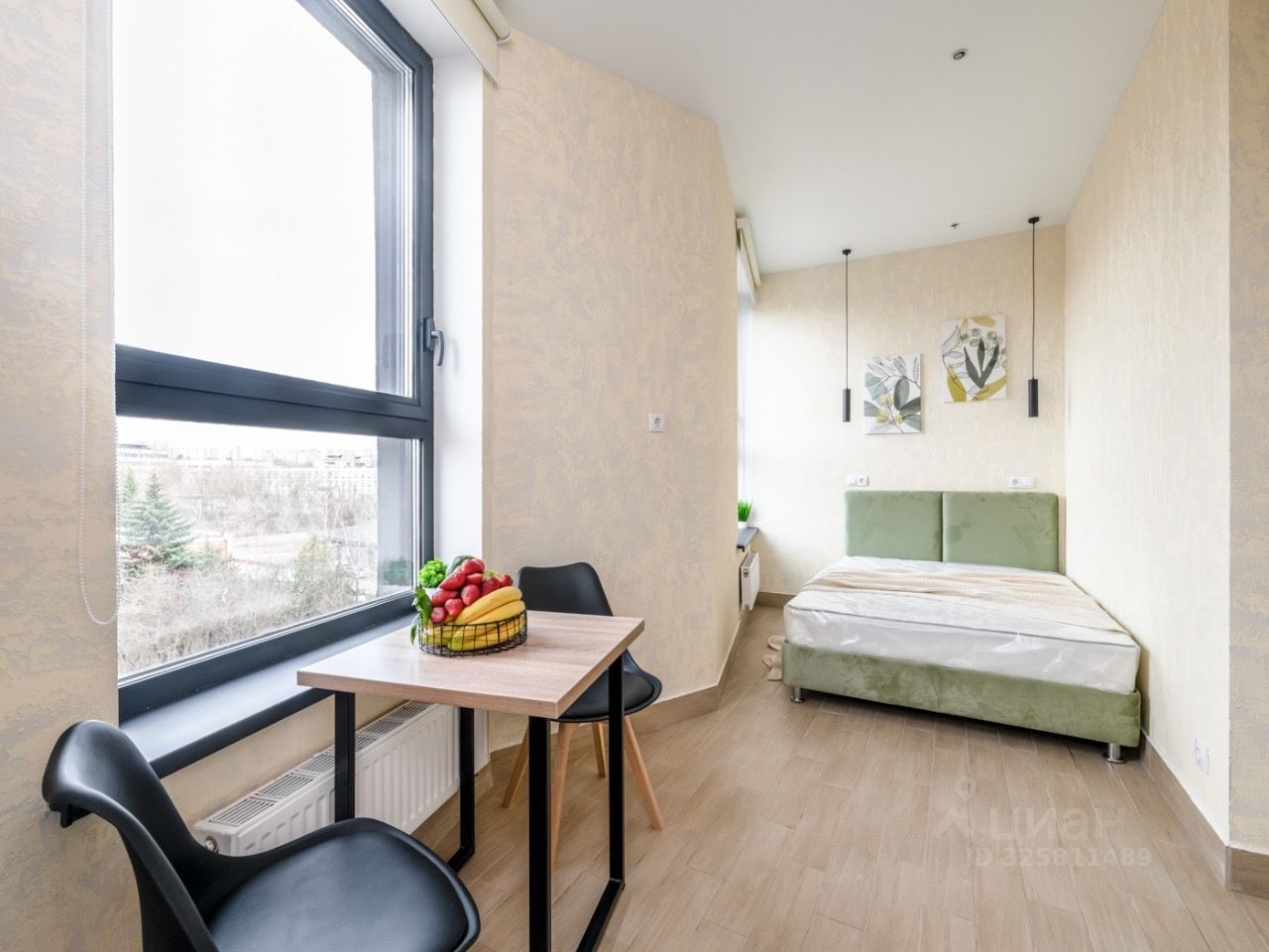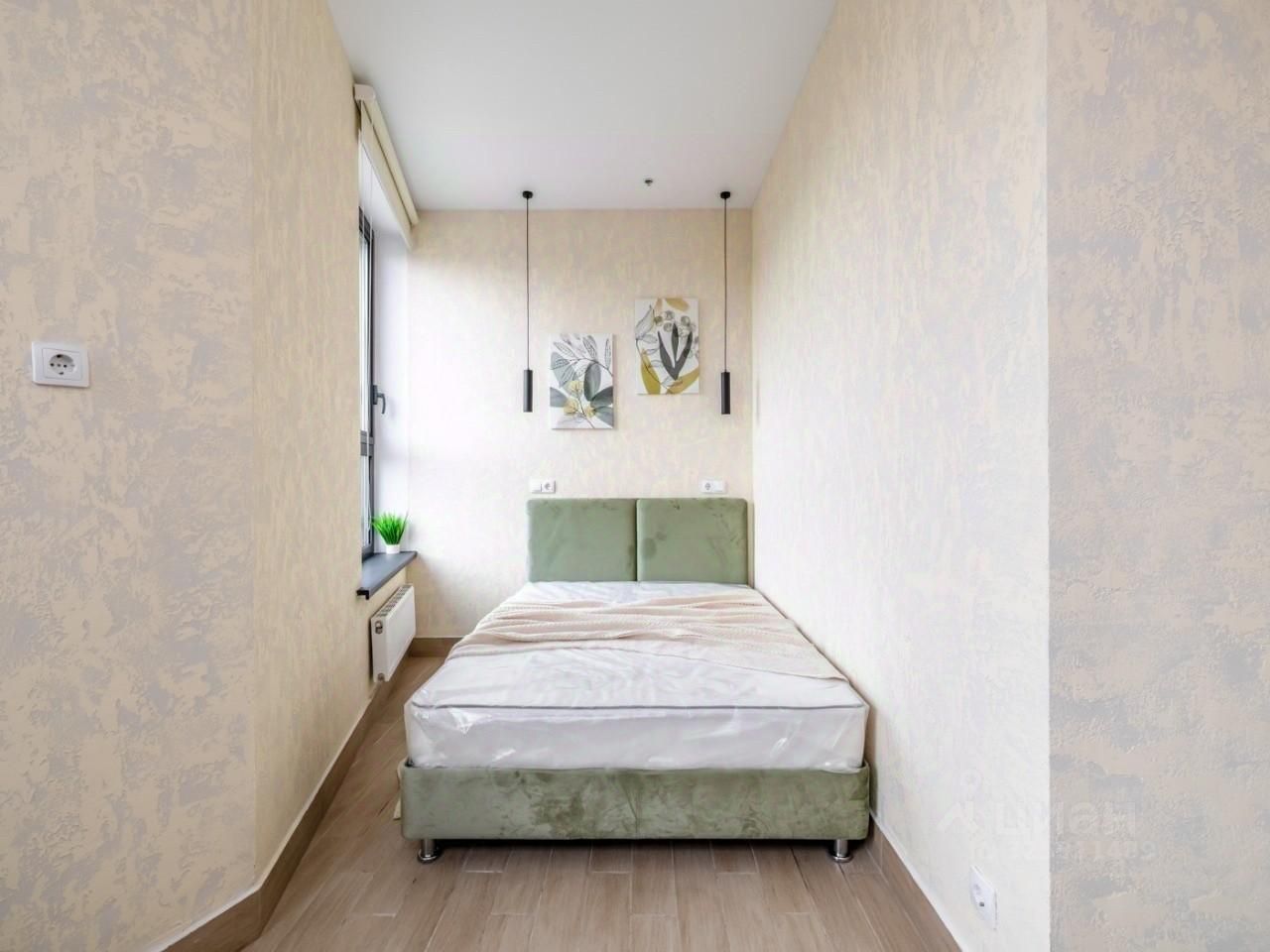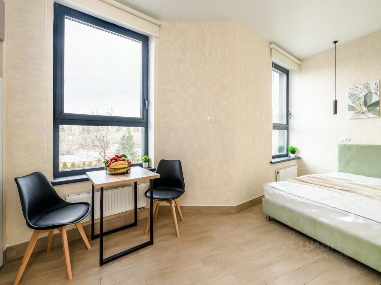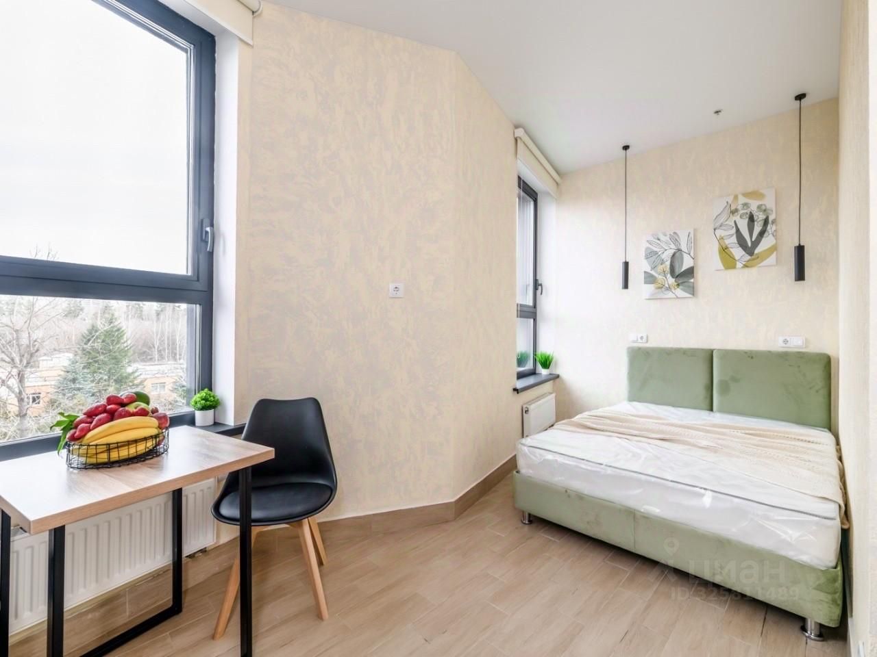 Встроенная кухню, микроволновка, стиральная машина, кровать, большой шкаф, есть возможность разместить дополнительные места хранения, два больших панорамных окна выходят во двор.