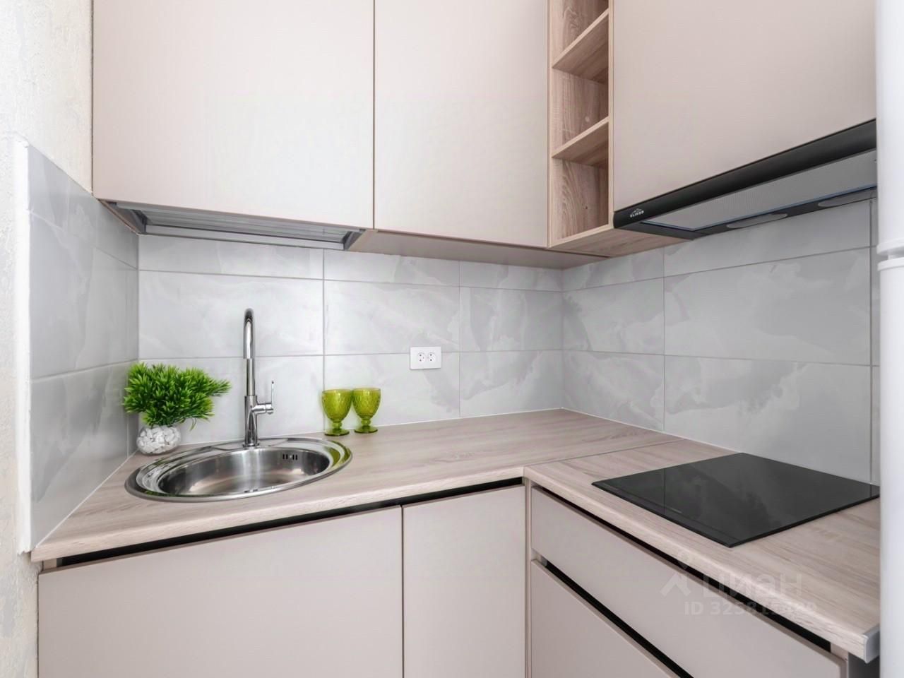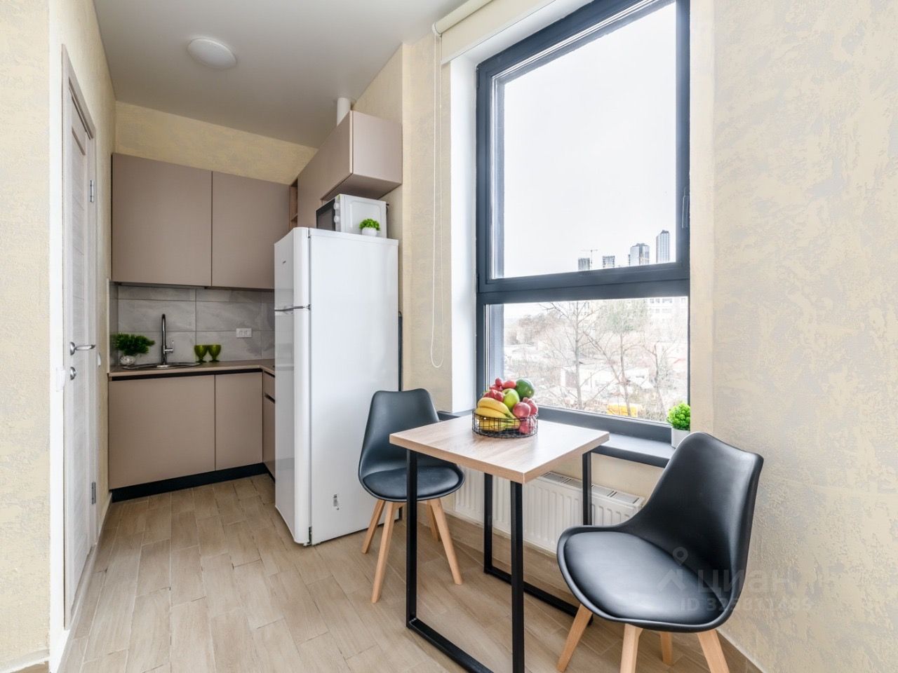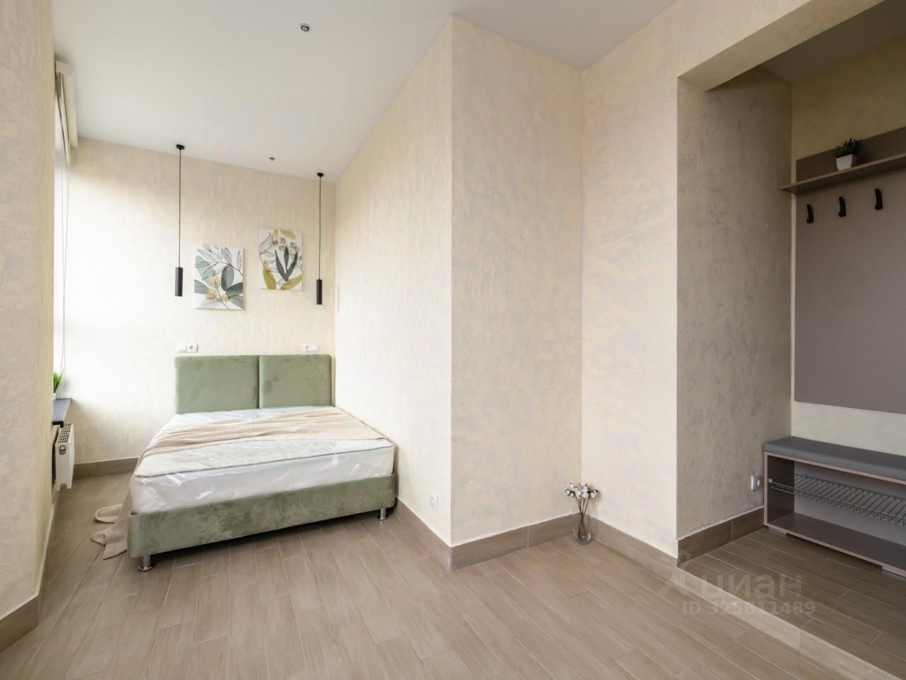 Встроенная кухню, микроволновка, стиральная машина, кровать, большой шкаф, есть возможность разместить дополнительные места хранения, два больших панорамных окна выходят во двор.
