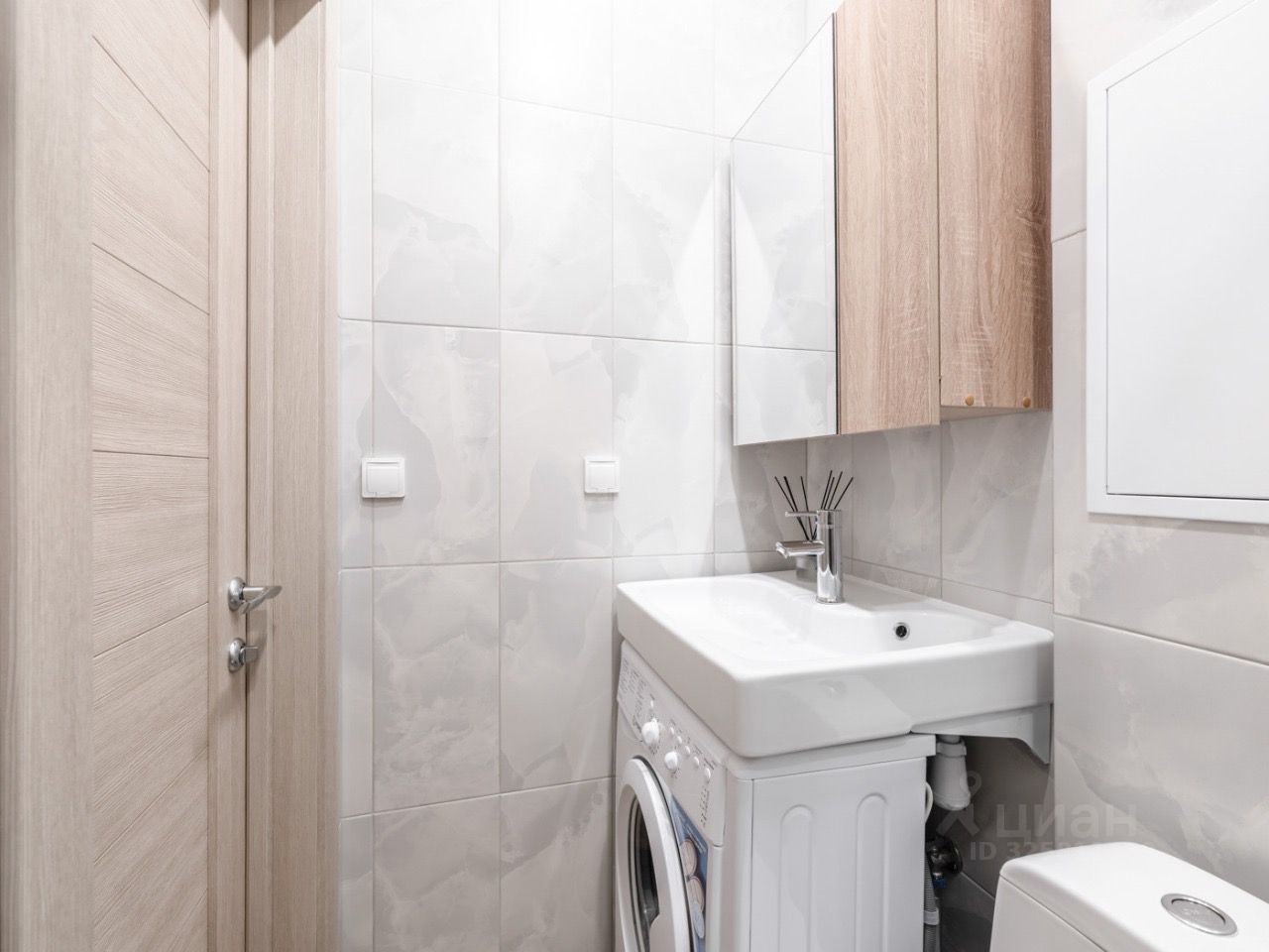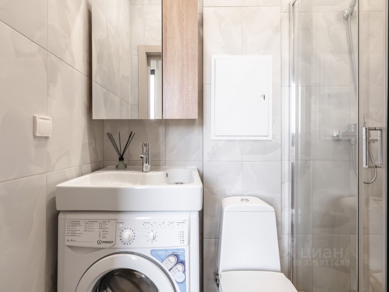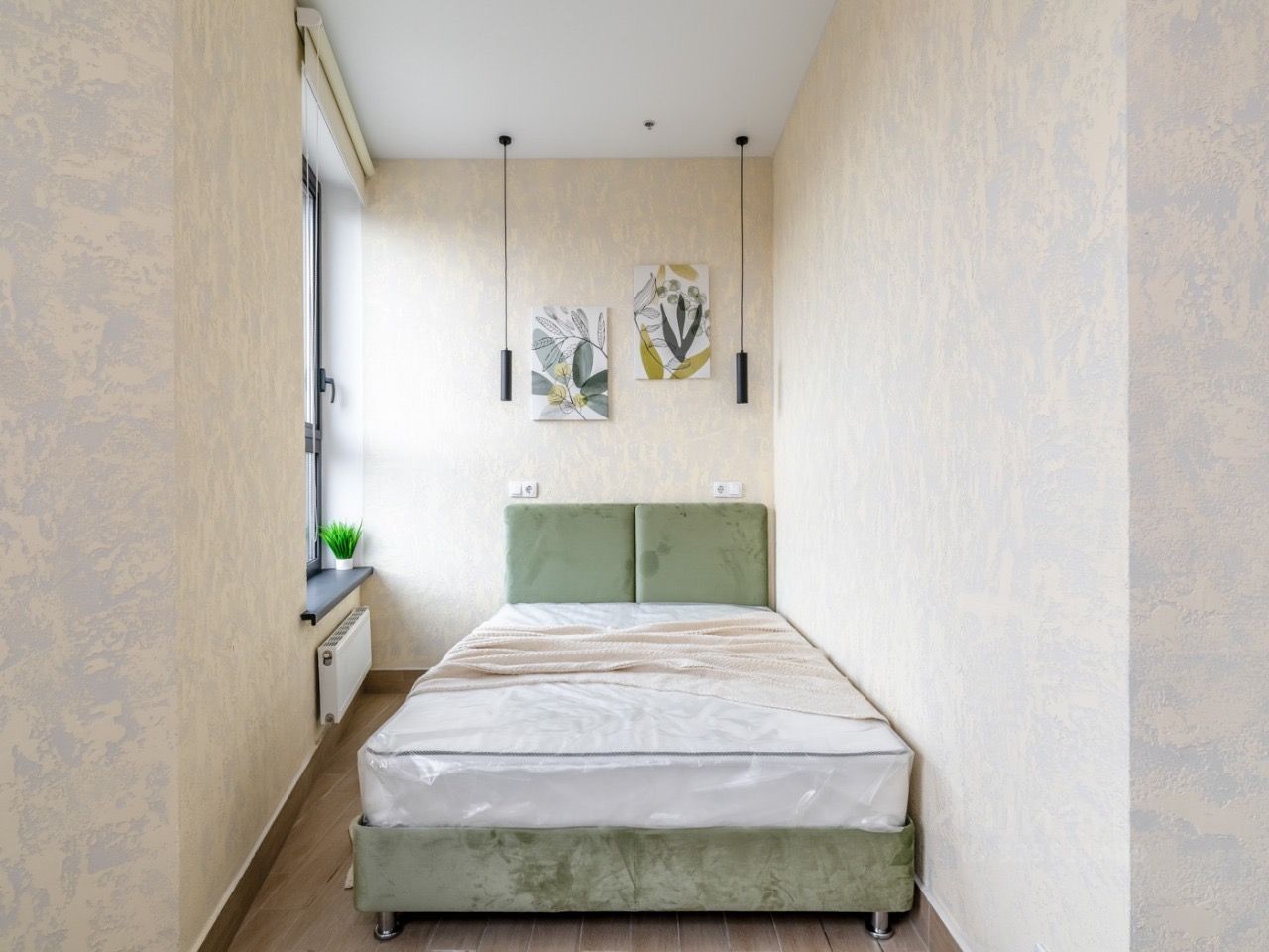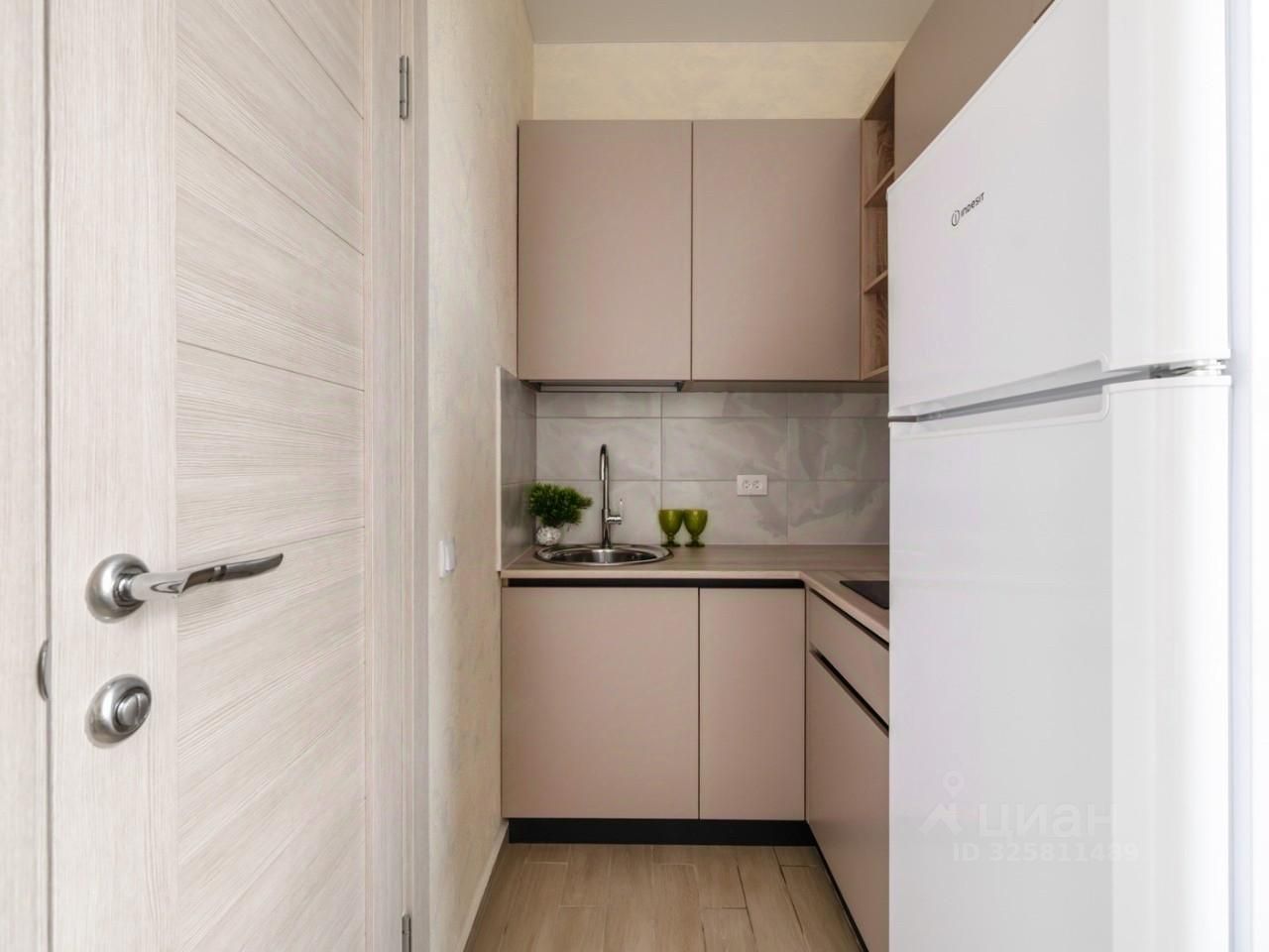 Встроенная кухню, микроволновка, стиральная машина, кровать, большой шкаф, есть возможность разместить дополнительные места хранения, два больших панорамных окна выходят во двор.