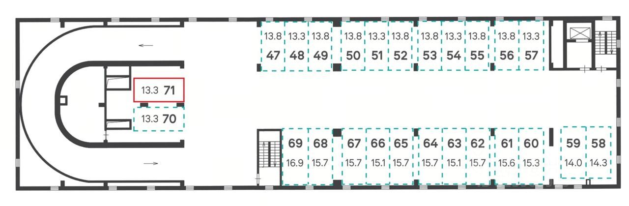 Просторное машино место 71 площадью 13.3 м., расположено на 3-м уровне закрытого паркинга и способно разместить легковой автомобиль любых габаритов. Дополнительная территория сбоку и за машино-местом обеспечивает комфортную посадку водителя в автомобиль, а также, удобную погрузку и выгрузку вещей из багажника.