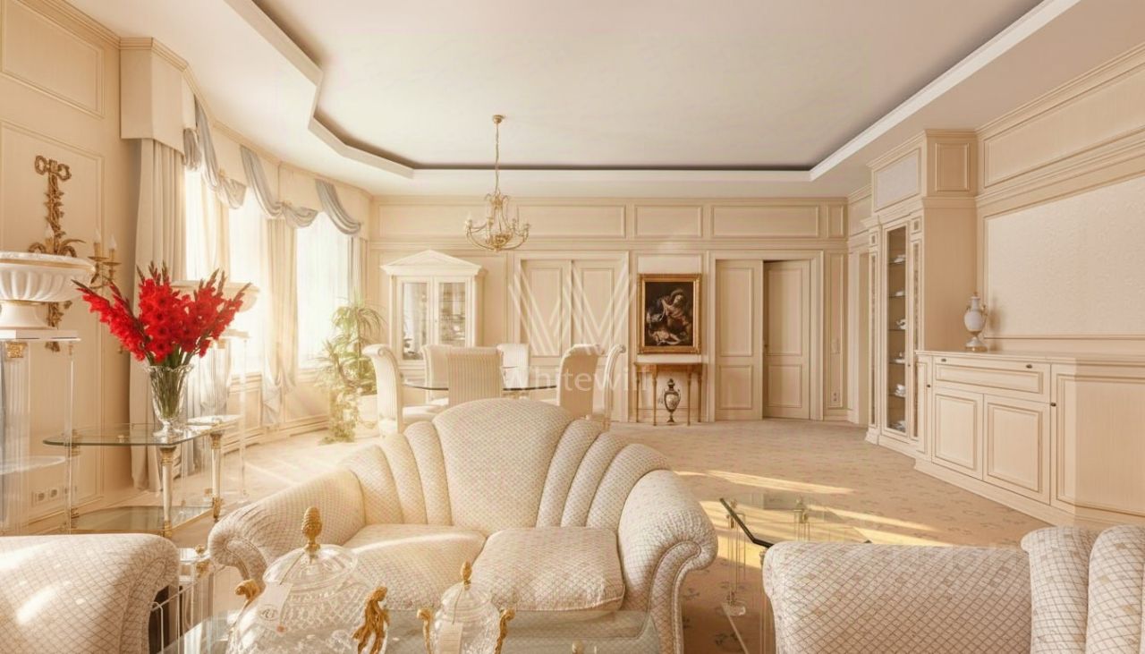 Здесь много воздуха: площадь 170 м² и потолки 3,5 метра — объем, недоступный современным новостройкам. Гостиная (54 м²) наполнена светом, который подчеркивает панели из натурального дерева Truggelmann. Центр притяжения — дровяной камин. Живой огонь, бокал вина и абсолютная тишина станут вашим ритуалом завершения дня.