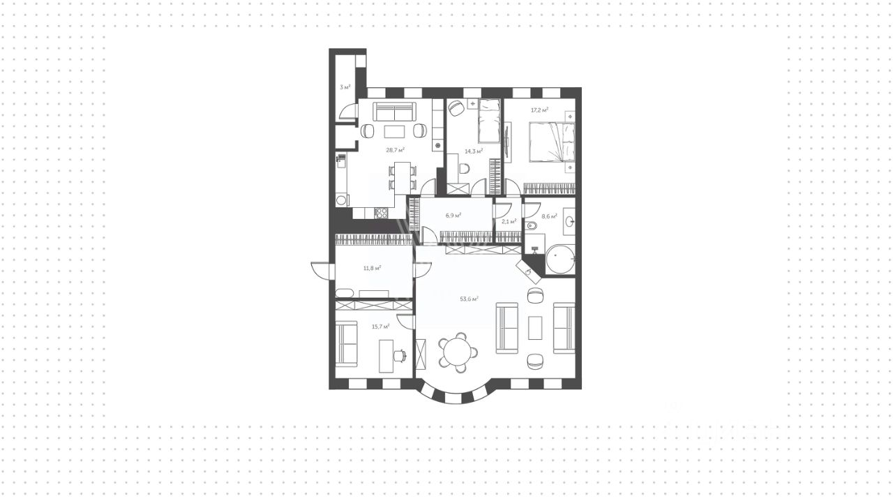 Текущая планировка включает 3 комнаты и просторную общественную зону. Конструктив позволяет гибко использовать пространство: