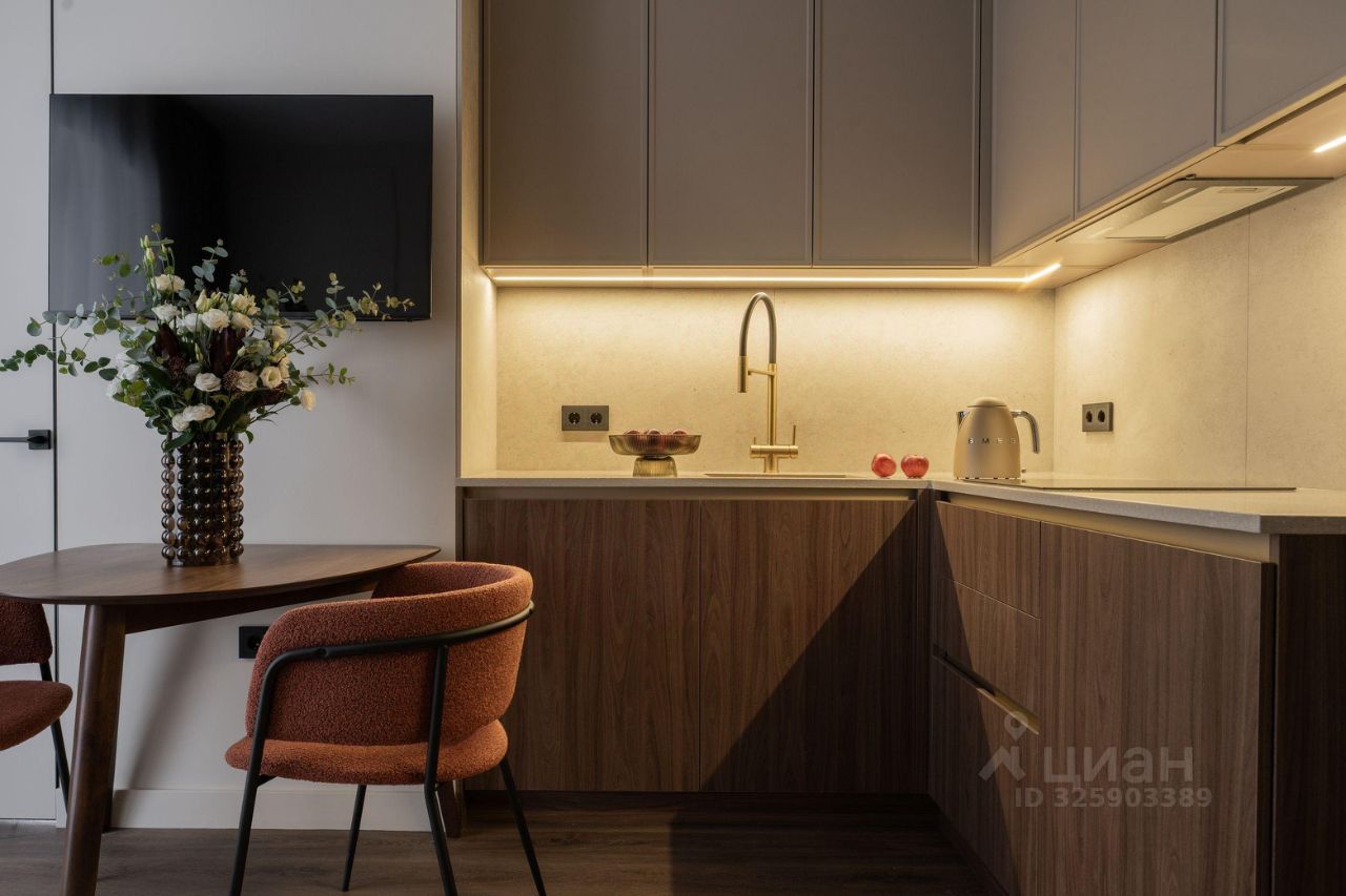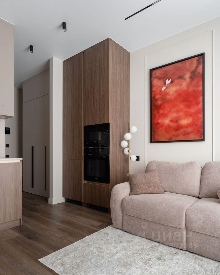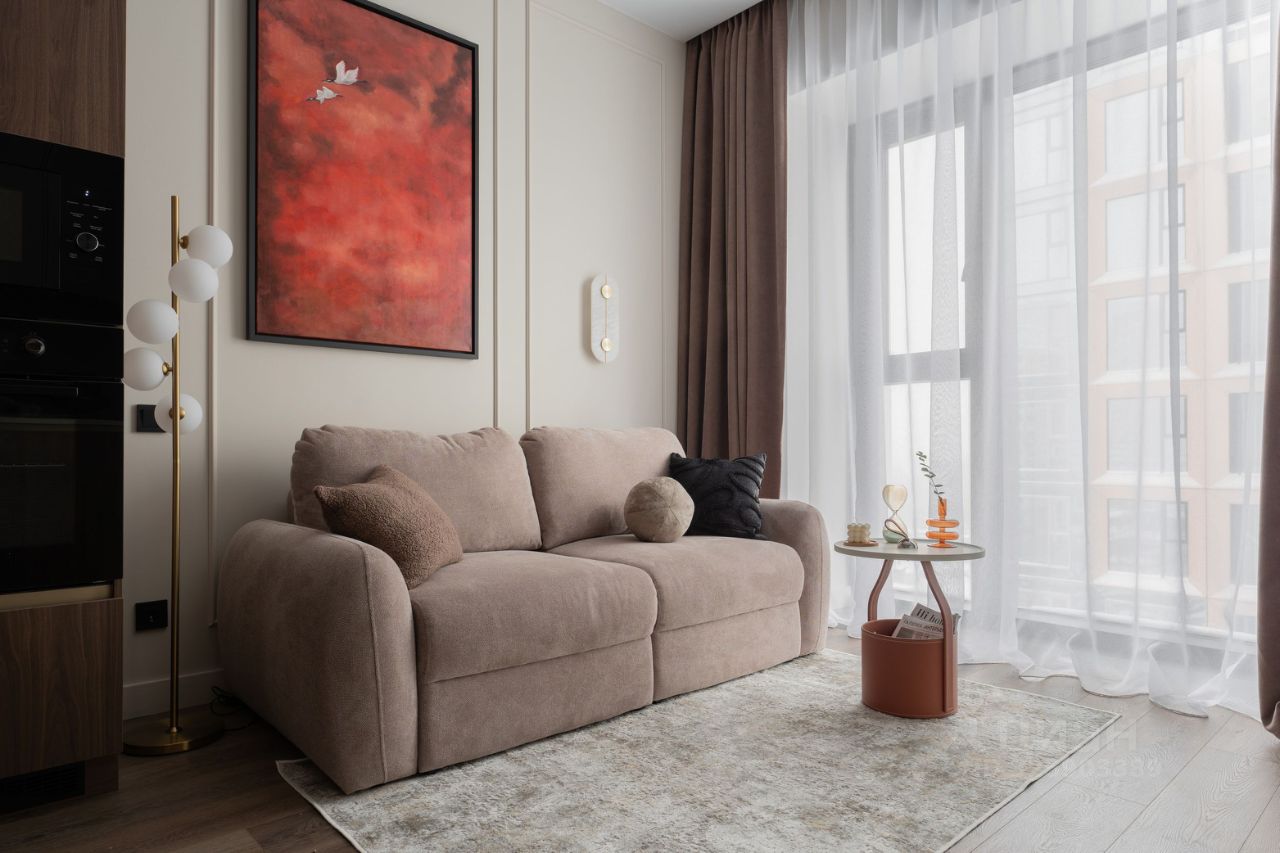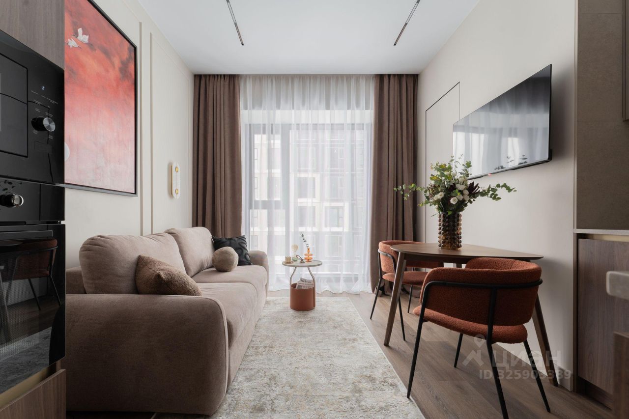 В зоне кухни полный комплект высококачественной встроенной техники , включая холодильник с морозильной камерой, посудомоечную машину, духовой шкаф, микроволновую печь, индукционную варочную поверхность и вытяжку. Предусмотрены удобные места для хранения посуды и продуктов, а также элегантная обеденная зона с отдельным освещением. У панорамного окна расположена зона отдыха с раскладным диваном и телевизором. В спальне большая кровать 160*200 с качественным матрасом и подъемным механизмом, а также вместительный 2,5-метровый шкаф.