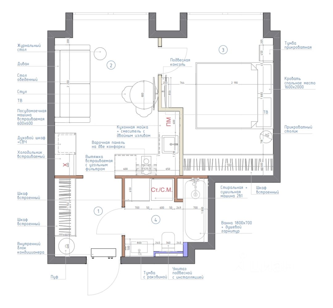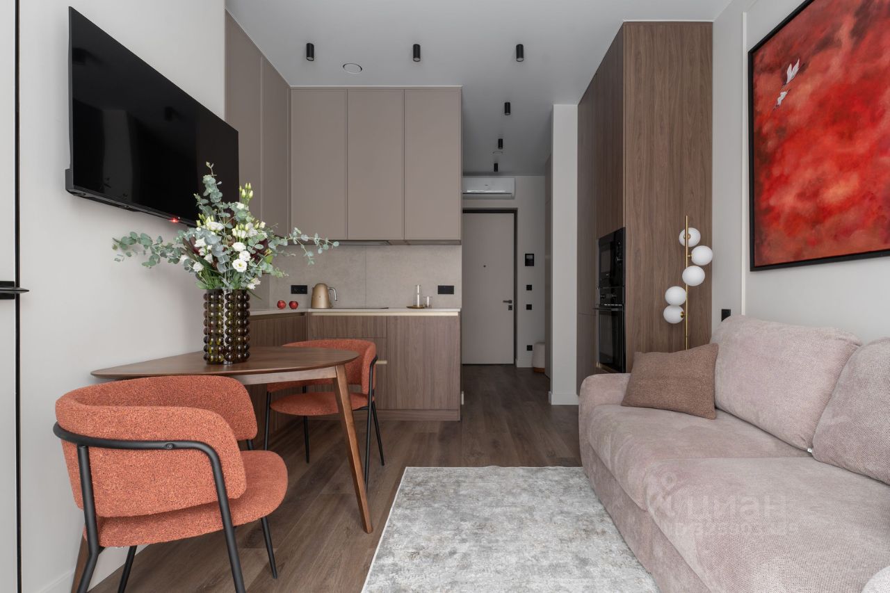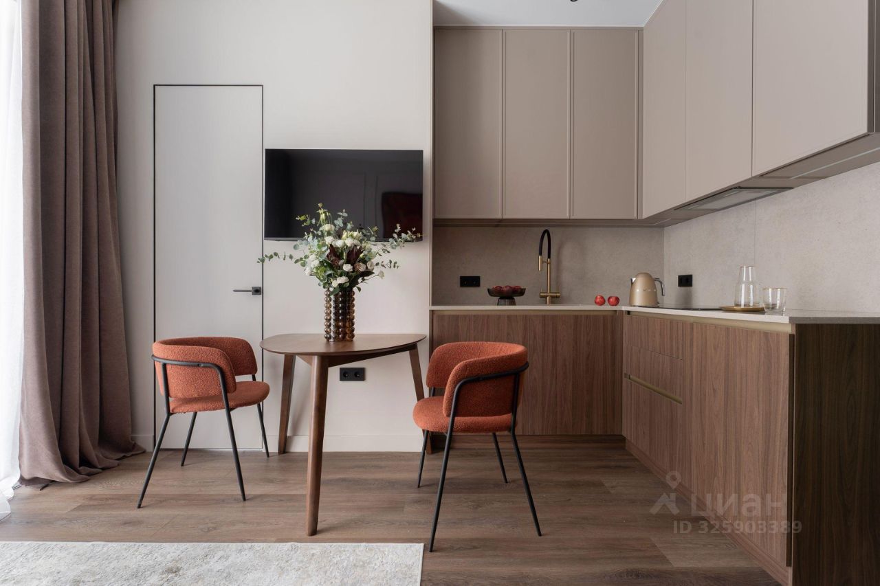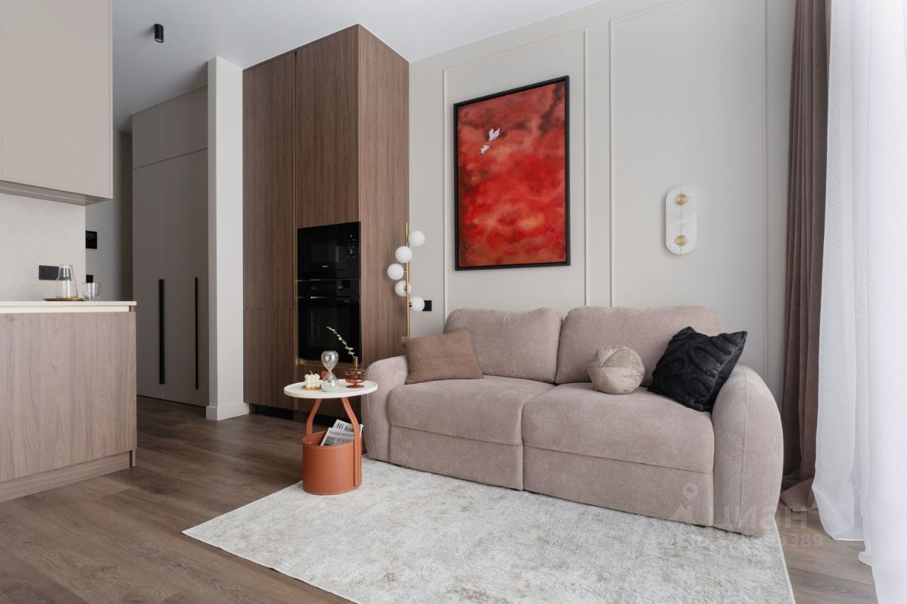 В зоне кухни полный комплект высококачественной встроенной техники , включая холодильник с морозильной камерой, посудомоечную машину, духовой шкаф, микроволновую печь, индукционную варочную поверхность и вытяжку. Предусмотрены удобные места для хранения посуды и продуктов, а также элегантная обеденная зона с отдельным освещением. У панорамного окна расположена зона отдыха с раскладным диваном и телевизором. В спальне большая кровать 160*200 с качественным матрасом и подъемным механизмом, а также вместительный 2,5-метровый шкаф.
