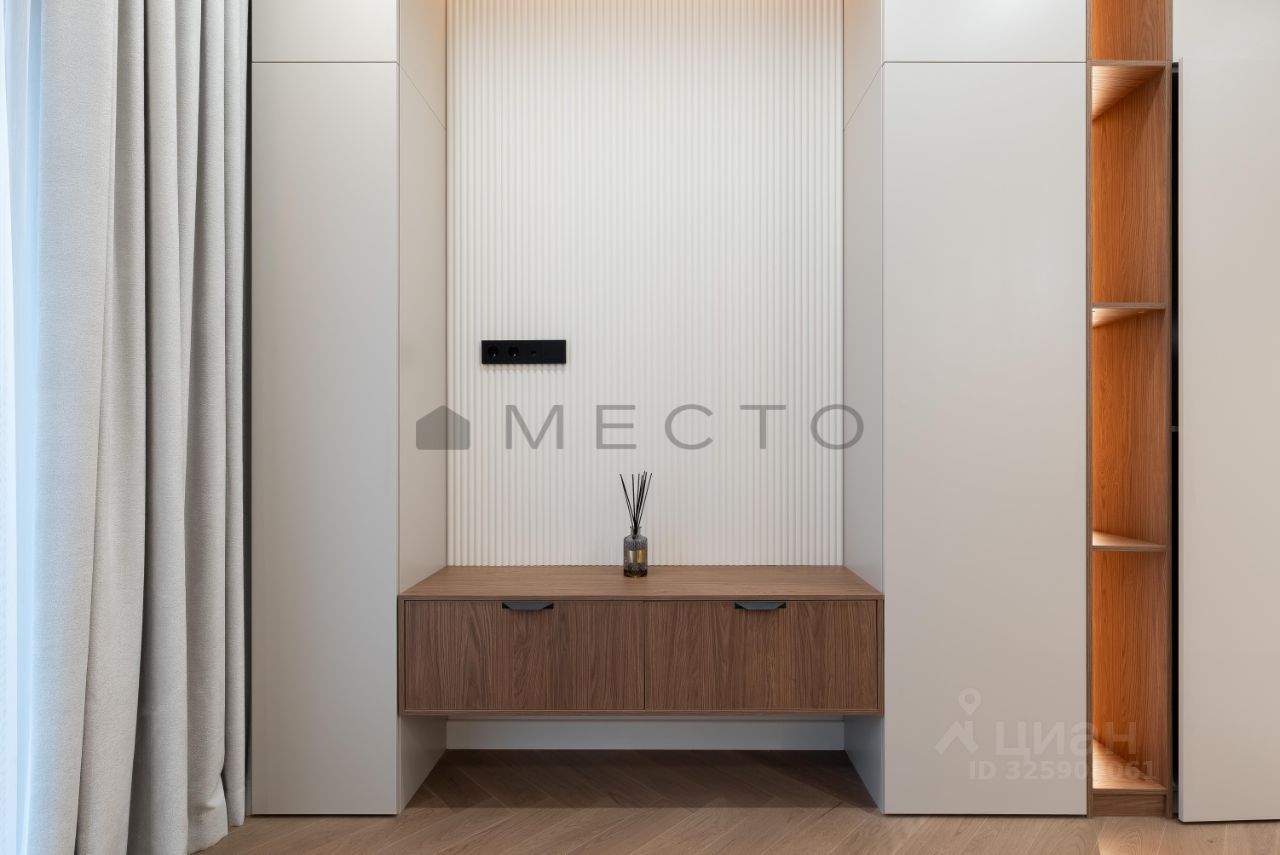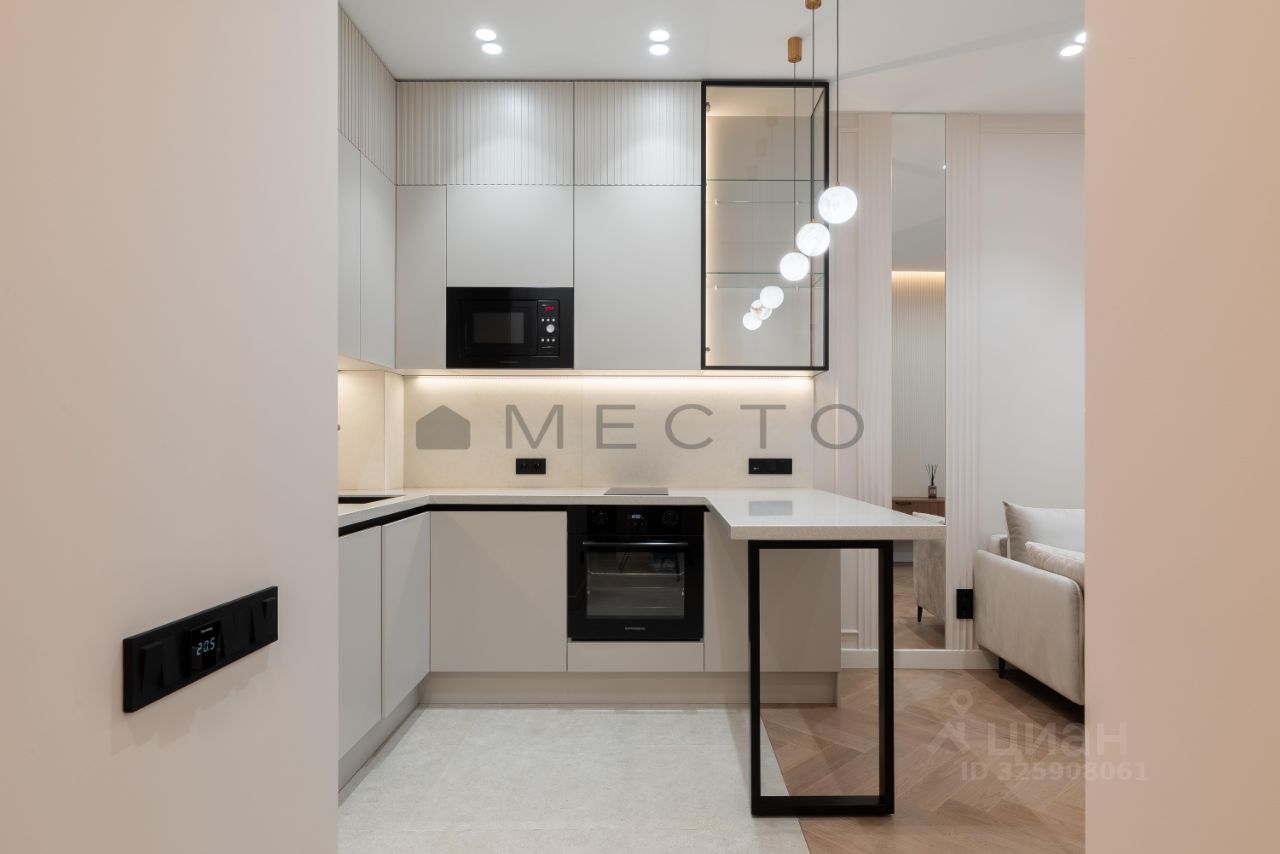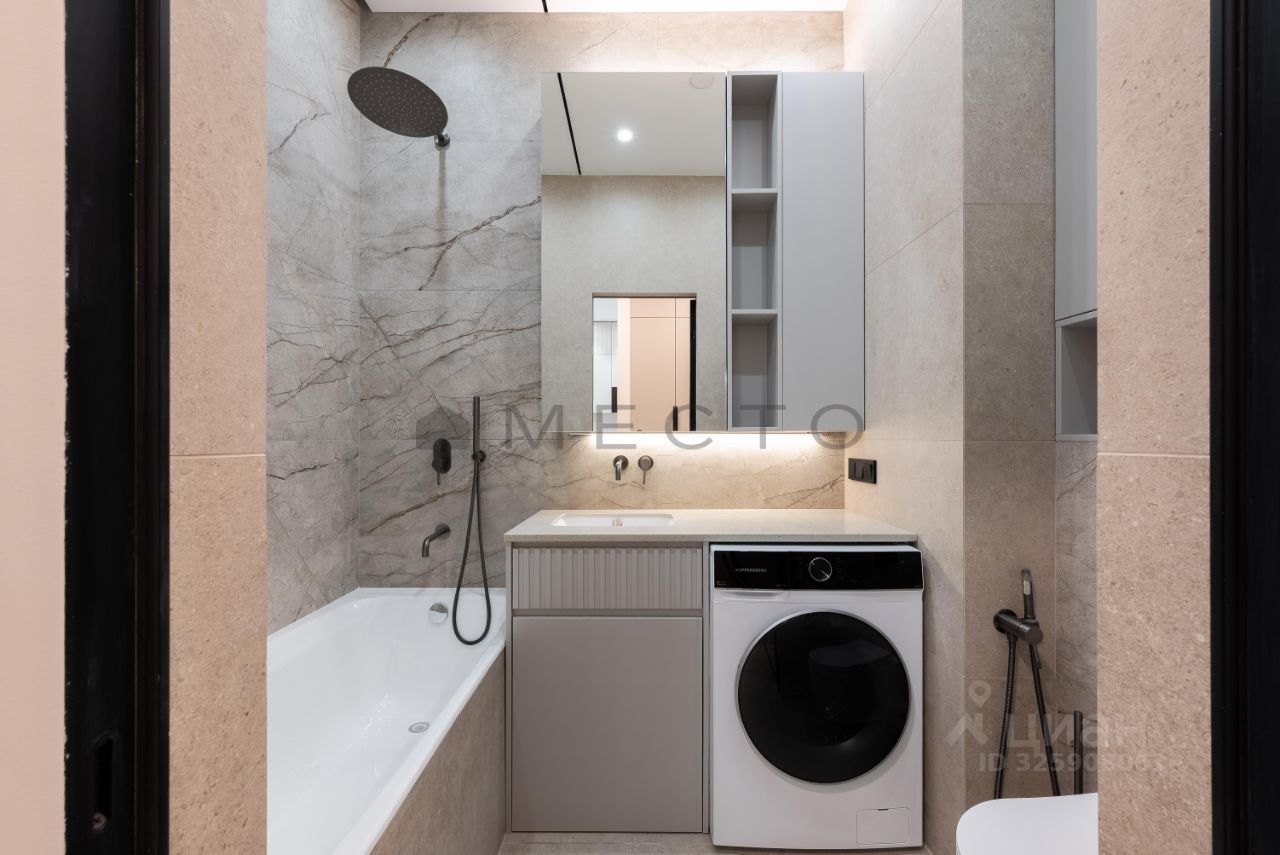 Светлая квартира с дизайнерским ремонтом, выполненным для себя. На полу - паркетная доска. В прихожей, ванной комнате и на кухне предусмотрен подогрев полов. Установлены кондиционеры как в спальне, так и в кухне-гостиной. В санузле есть всё необходимое: полноценная ванна и гигиенический душ. Кухня укомплектована немецкой техникой: посудомоечная машина, холодильник, духовой шкаф, вытяжка и микроволновая печь. В спальне - большое количество систем хранения и удобная рабочая зона. Окна выходят во внутренний двор с собственным фонтаном.