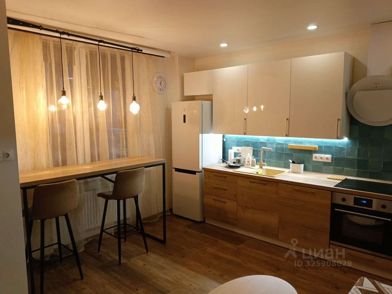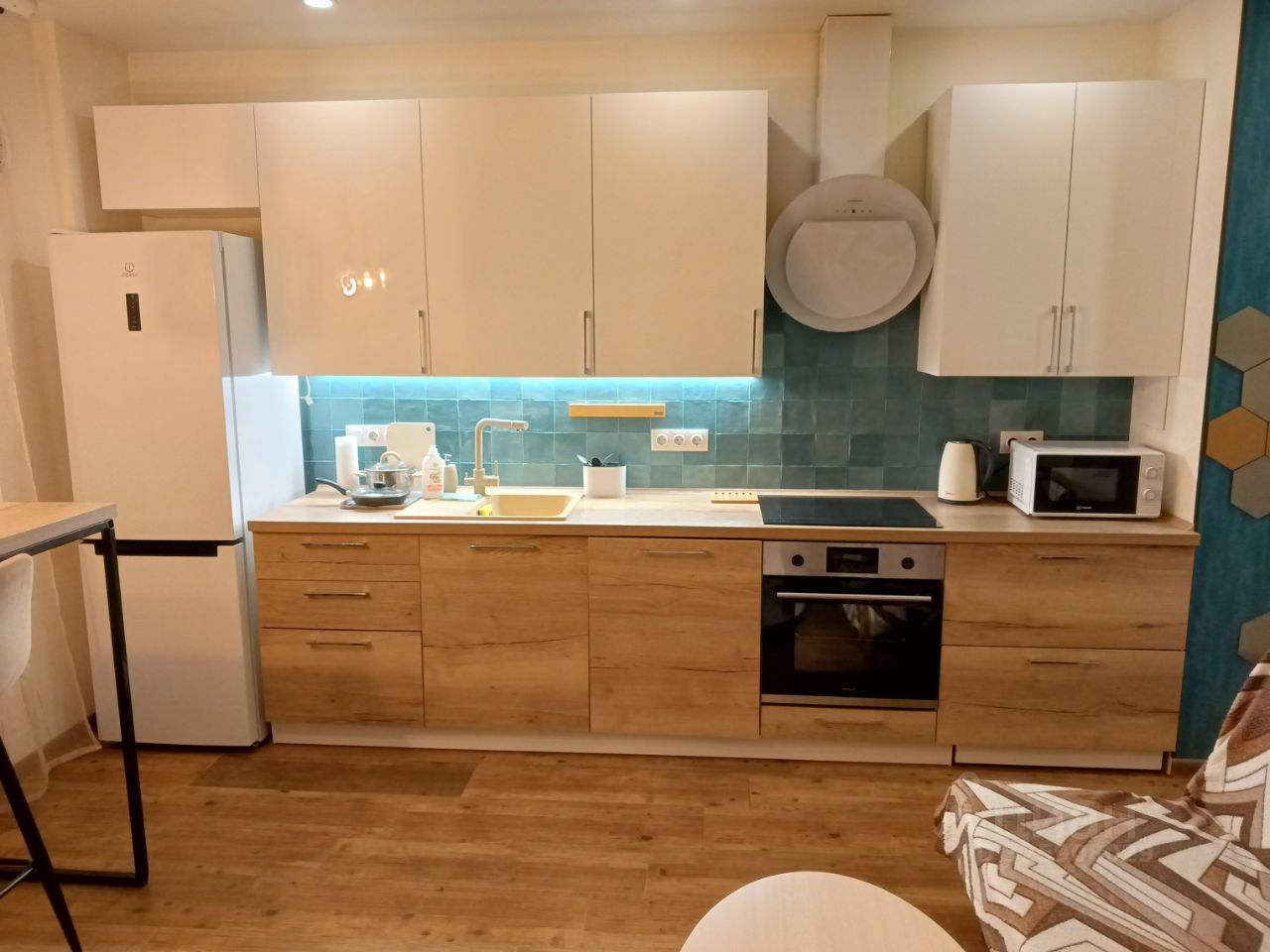 В квартире выполнен качественный евроремонт. В кухонной зоне установлена современная мебель и вся необходимая техника: холодильник, посудомоечная и стиральная машины. В комнате также есть мебель, которая делает пространство функциональным и комфортным. Совмещенный санузел оборудован душевой кабиной.