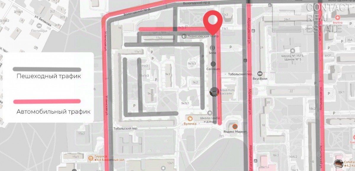 Помещение площадью 103,3 кв.м, находится на первой линии домов, в центре жилого массива, интенсивный пешеходный и автомобильный трафик вдоль помещения.