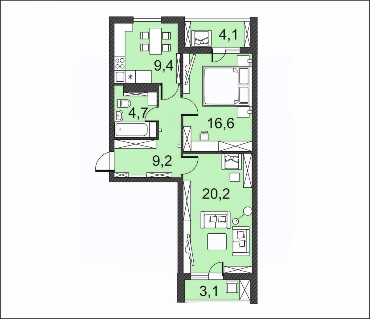 Двухкомнатная квартира 67,3 м², 4/17 эт.