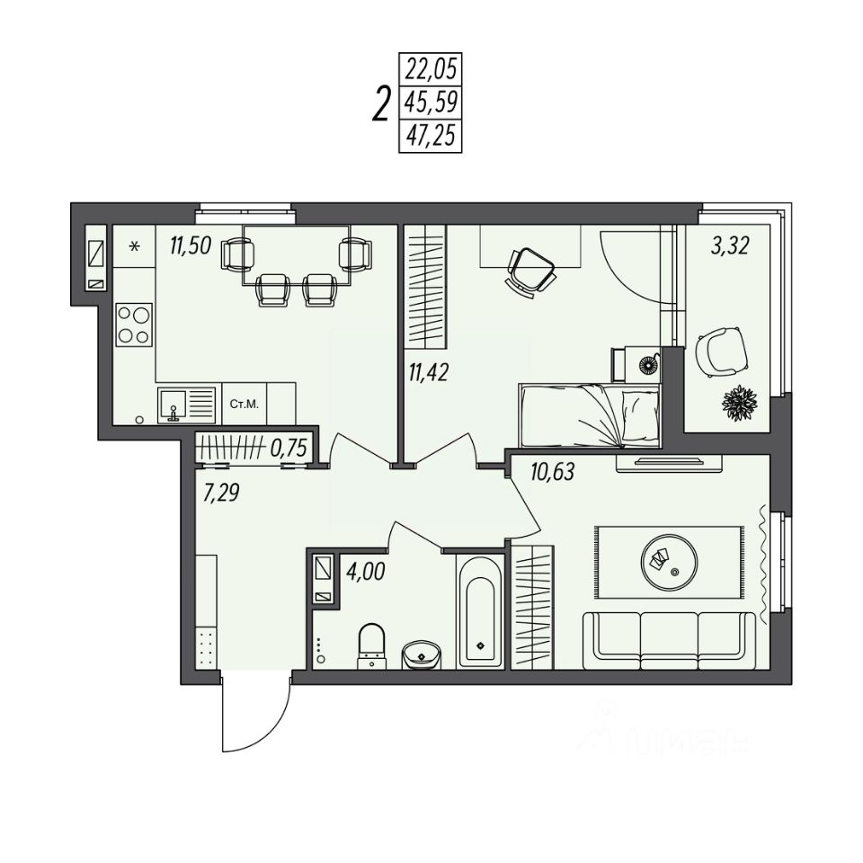 Общая площадь47,25 м2