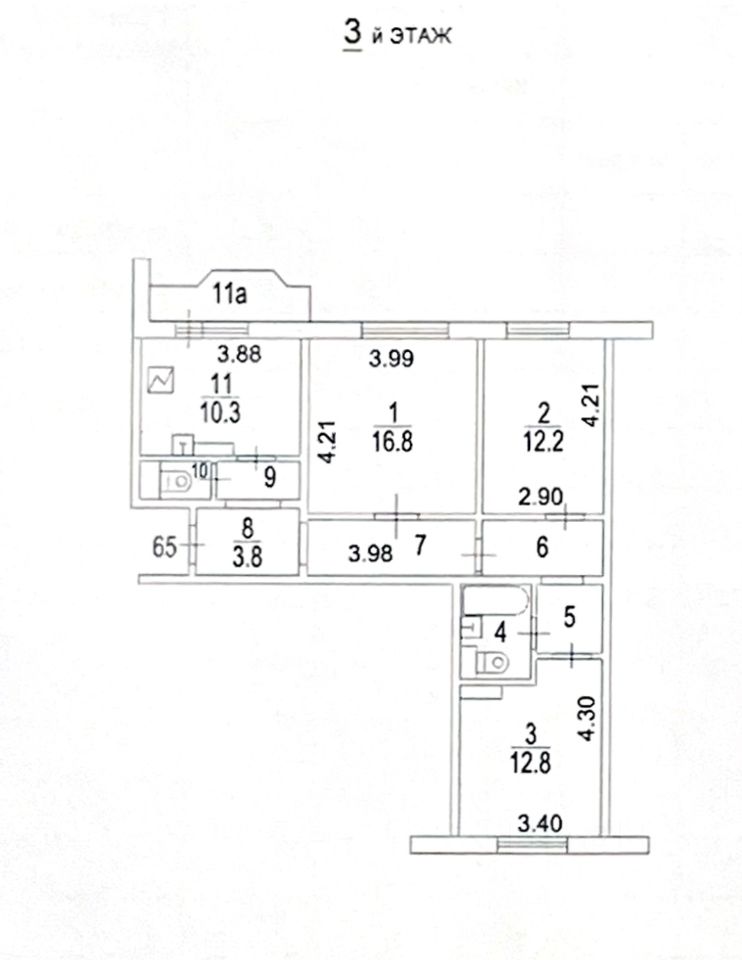 Три изолированные комнаты (16,8 - 12,8 - 12,2 кв.м.). Распашонка.