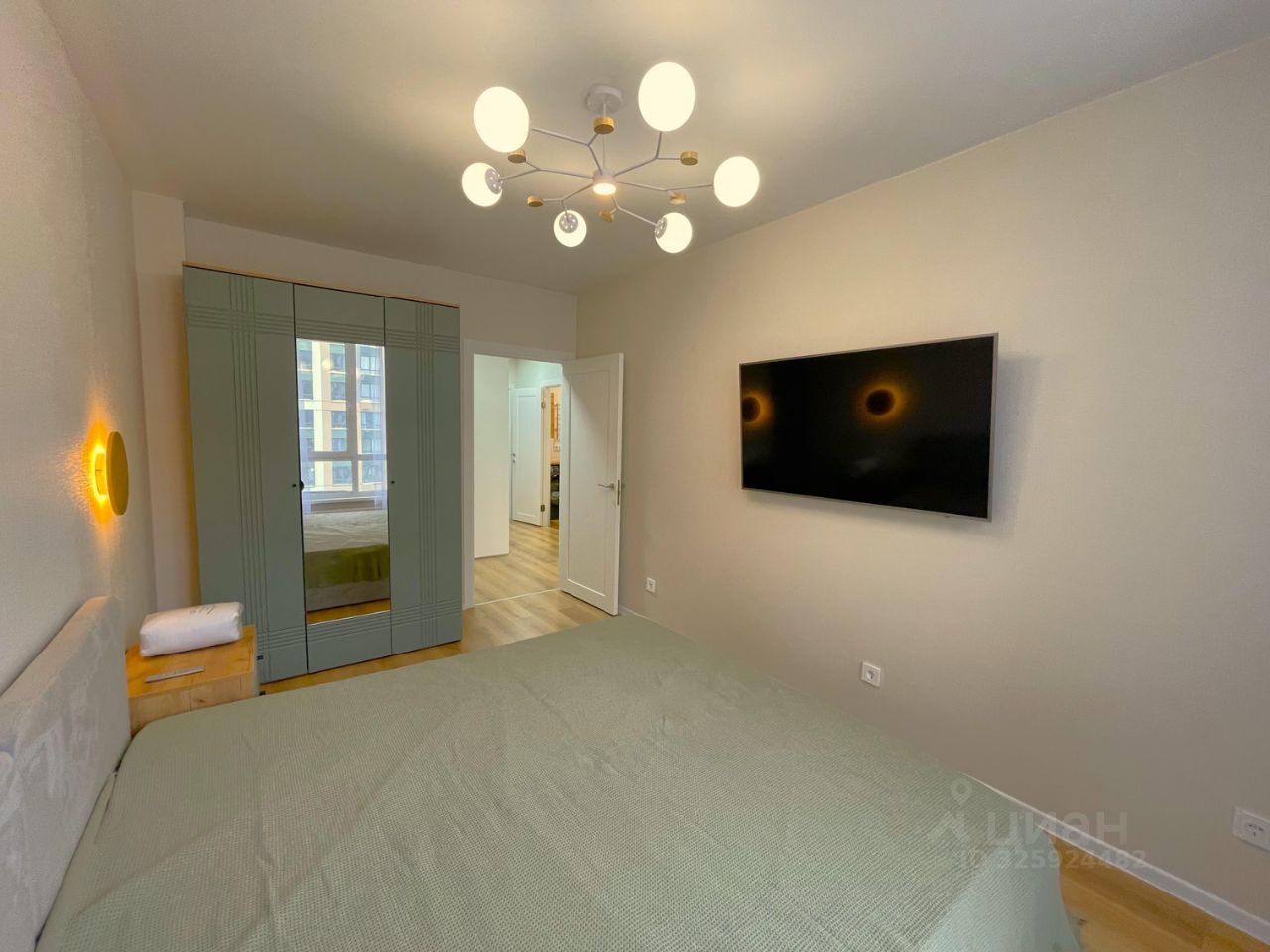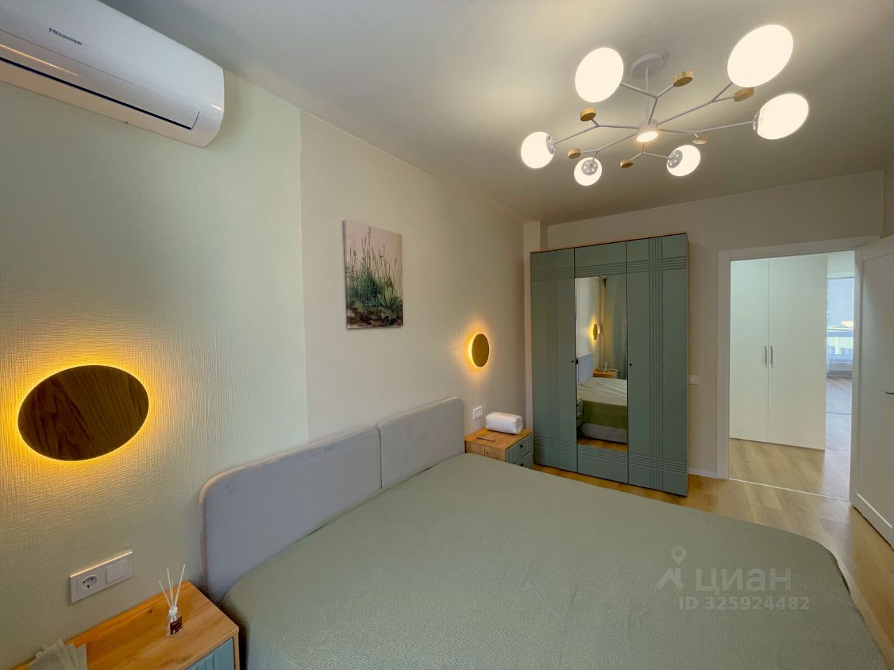 - Спальня: новая двуспальная кровать с матрасом Ascona Promo 200х180см (в упаковке) и местом для хранения, 2 тумбочки, многосекционный шкаф с зеркалом для хранения вещей, ТВ Hisense 55E7KQ, кондиционер Hisense.