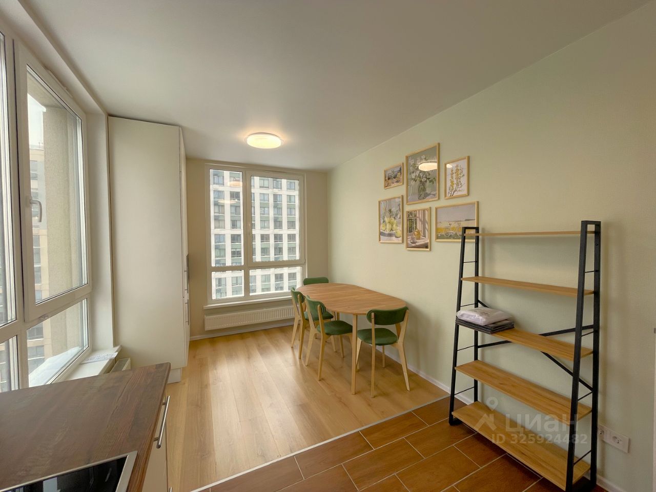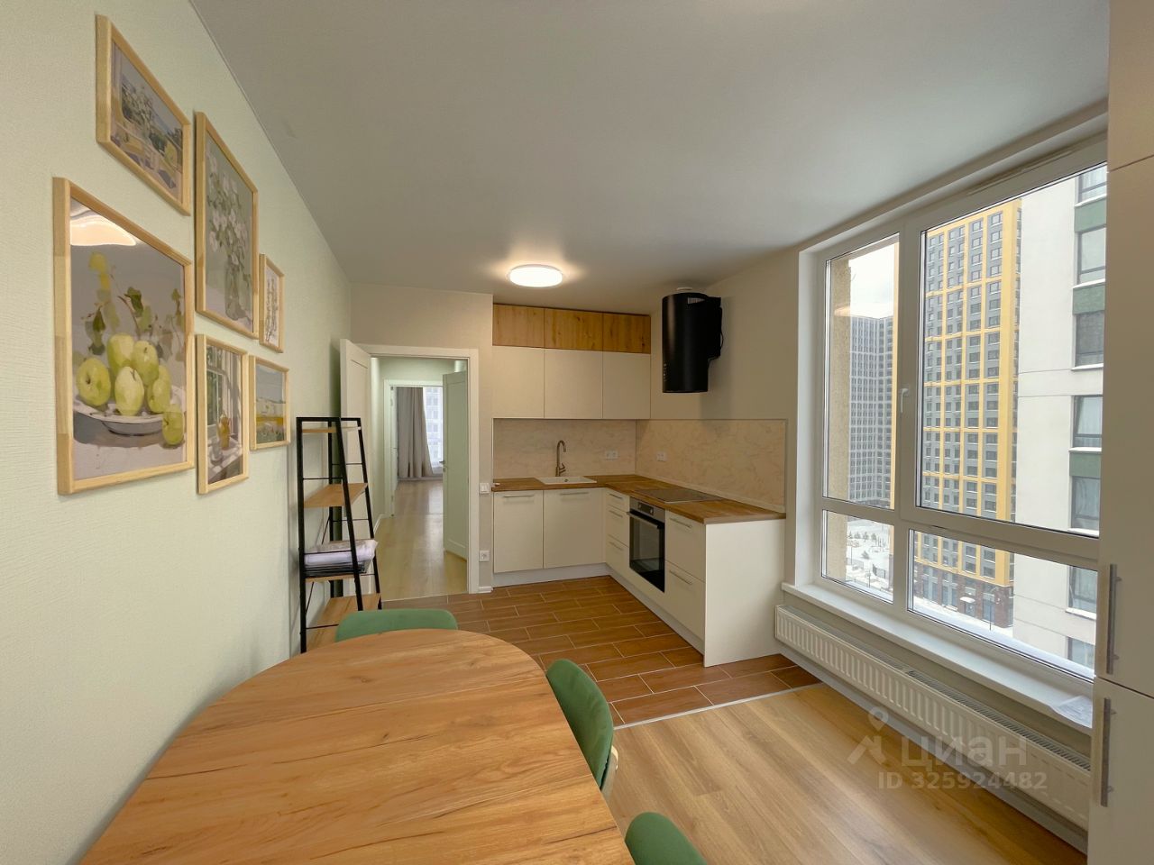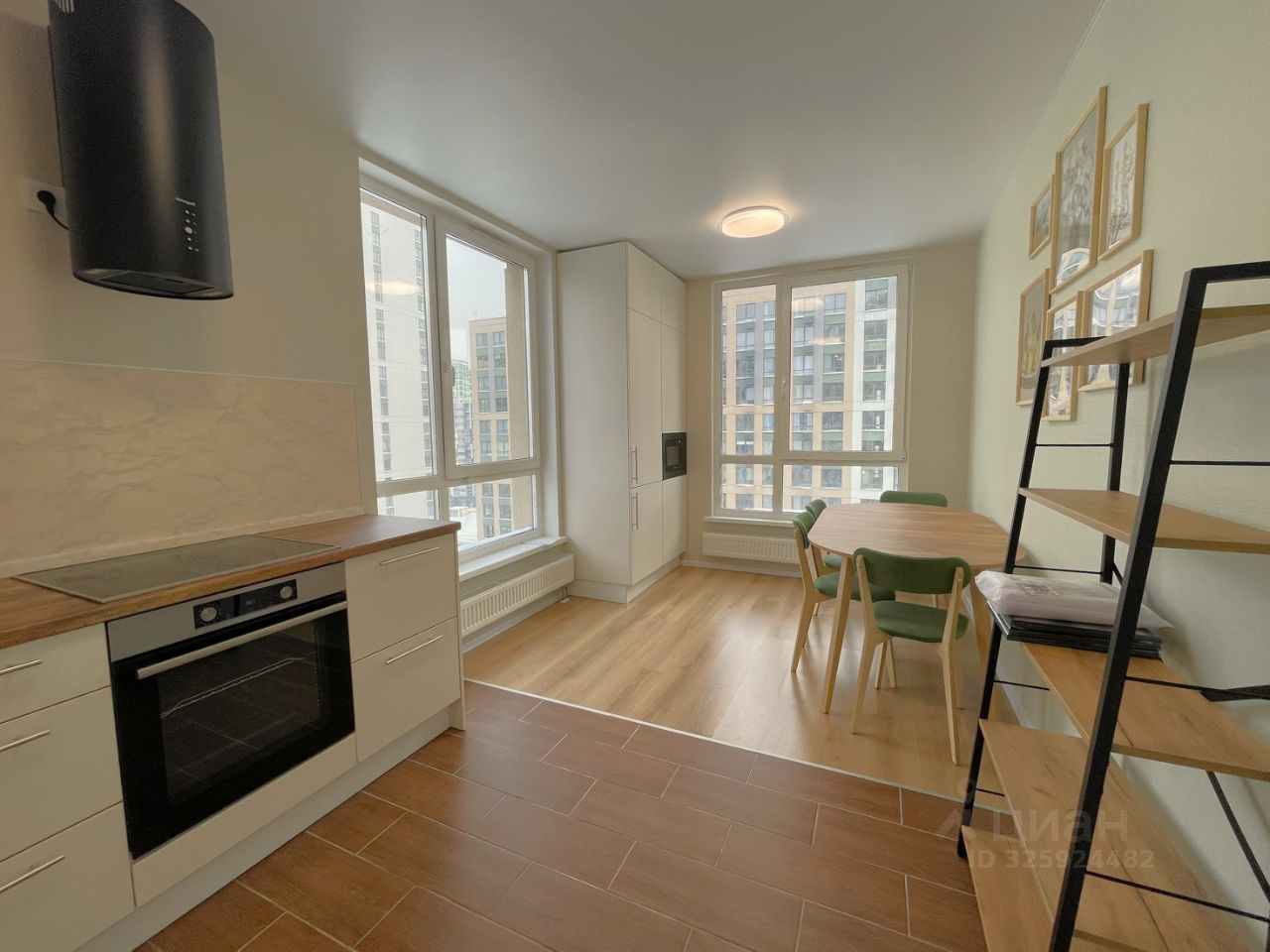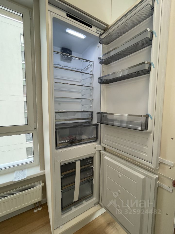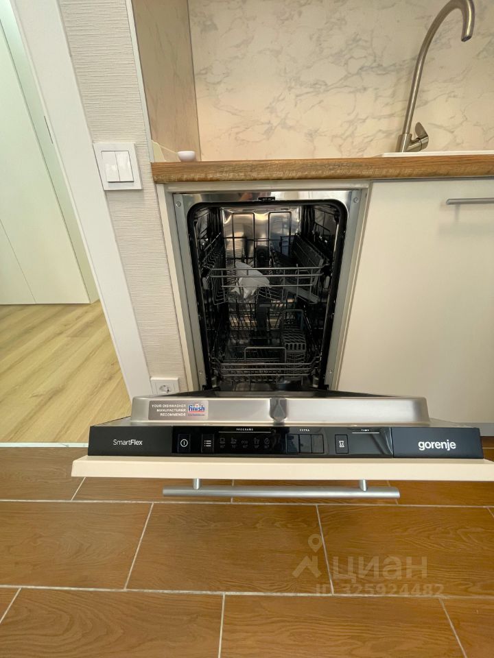 - Кухня квартиры с новым кухонным гарнитуром c большим количеством ящиков и шкафов для хранения оснащена новой бытовой техникой: варочной поверхностью и духовкой Gorenje, СВЧ-печью Samsung, встроенным холодильником и морозильной камерой Maunfeld, посудомоечной машиной Gorenje SmartFlex. Обеденная зона: раскладной обеденный стол на 6 персон, 4 стула. Полы: ламинат/плитка.