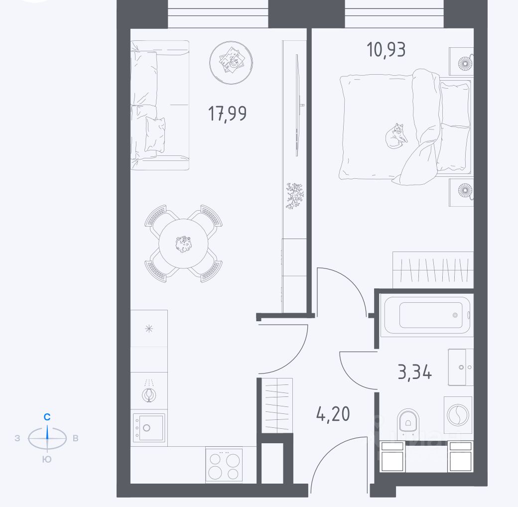 -Большая КУХНЯ-ГОСТИНАЯ - 18 метра!!! -Отдельная спальня - 11 метров.