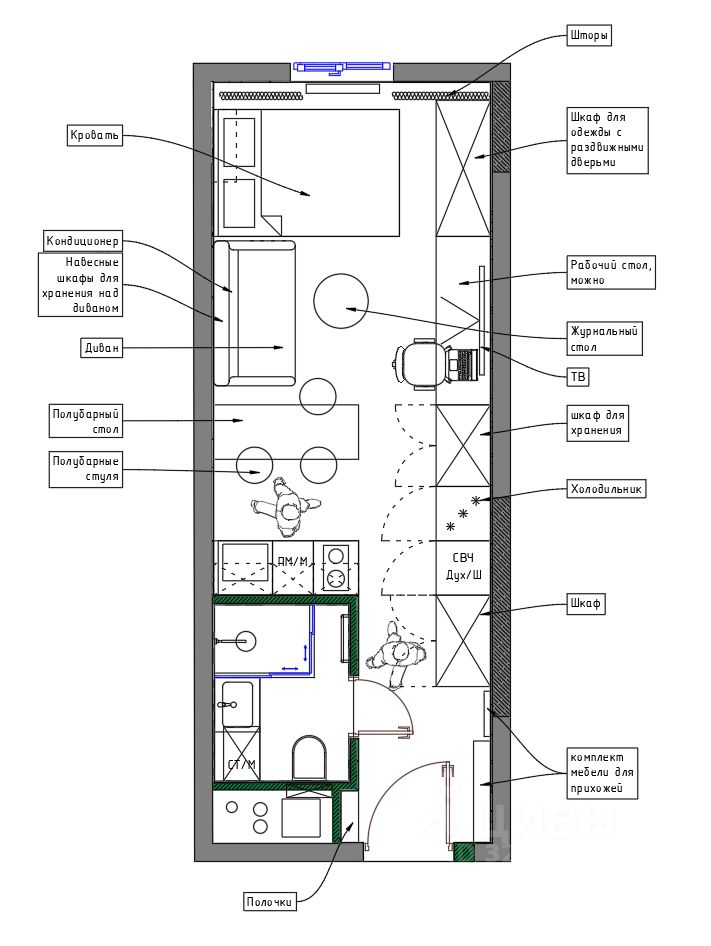 ПРИМЕЧАНИЯ Докупили стол который будет напротив дивана Кондиционер пока отсутствует подключим ближе к лету выводы под нее есть. ТВ 32 дюйма можем привезти если нужно, можем обсудит покупку нового ТВ