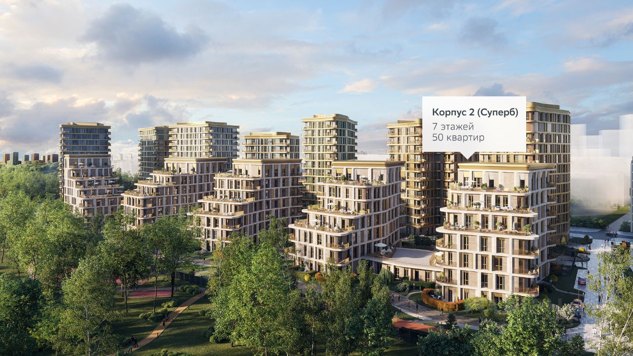 Отделка фасадов корпуса класса Суперб выполнена из природного камня. Дом возводится по технологии монолитного строительства. В квартире проведены работы по улучшению шумоизоляции, установлены двухкамерные стеклопакеты с низкоэмиссионными стёклами, минимизирующими теплопотери. Высота окон — от 3,1 до 3,25 м. Высота потолков —
