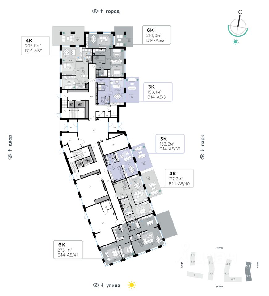 Архитектуру корпусов квартала разработало итальянское бюро. В облике отражена природная палитра: золотисто-бронзовый фасад корпуса Адвансд, выполненный из объёмных металлических элементов со сложным профилем, стал архитектурной доминантой квартала. Из окон открываются панорамные виды на реку и парк. Всего три минуты пешком — и вы на набережной. В14 примыкает к главному парку СберСити.