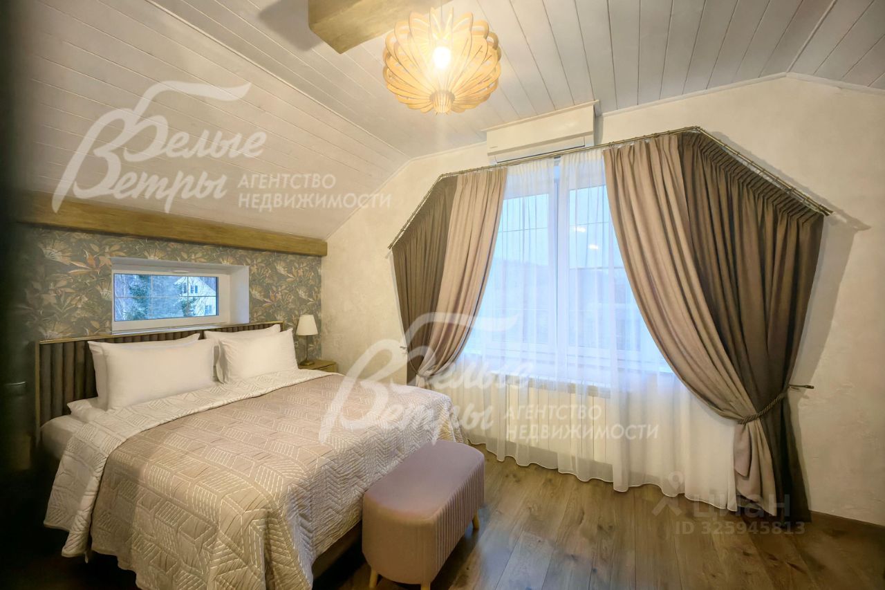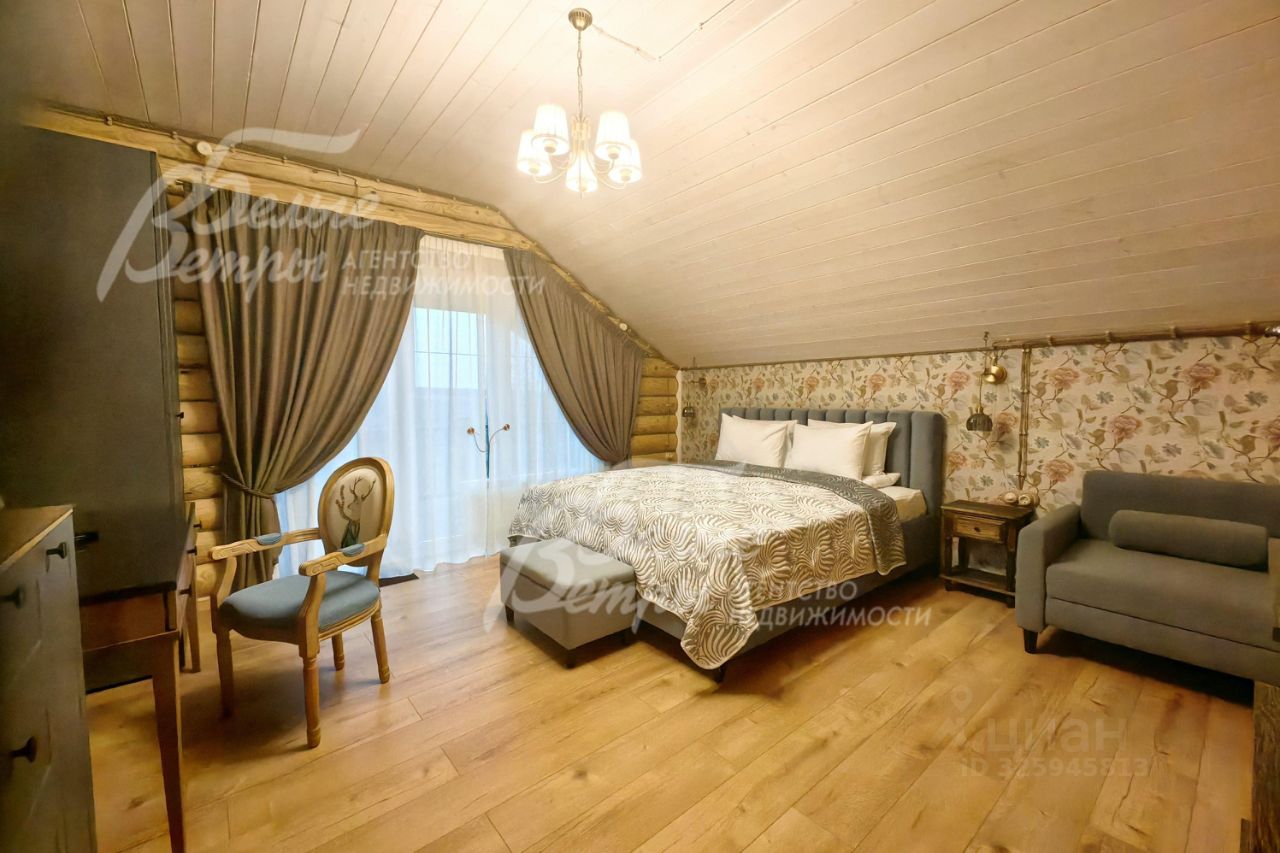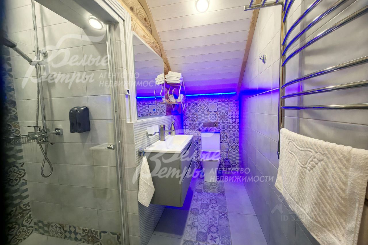 Описание внутренней отделки: стильная отделка в современные пастельных тонах: стены 2-го этажа - бревно и обои, высокие потолки, много света, ярких элементов интерьера. Окна второго этажа в доме панорамные и мансардные. В санузлах - плитка до потолка и бревно. Двери филенчатые белого цвета. Качественная стильная сантехника, большие душевые кабины с трапами..