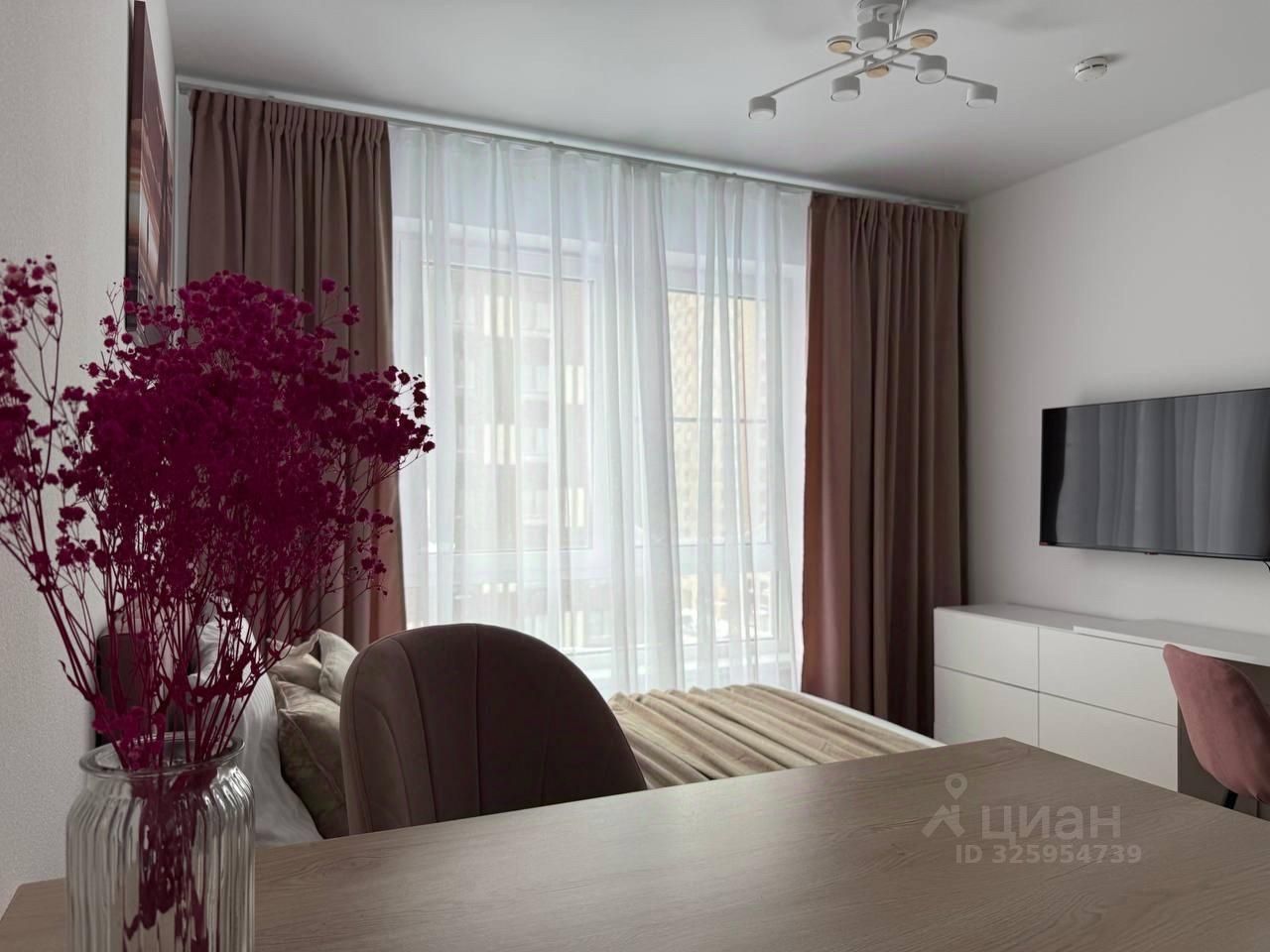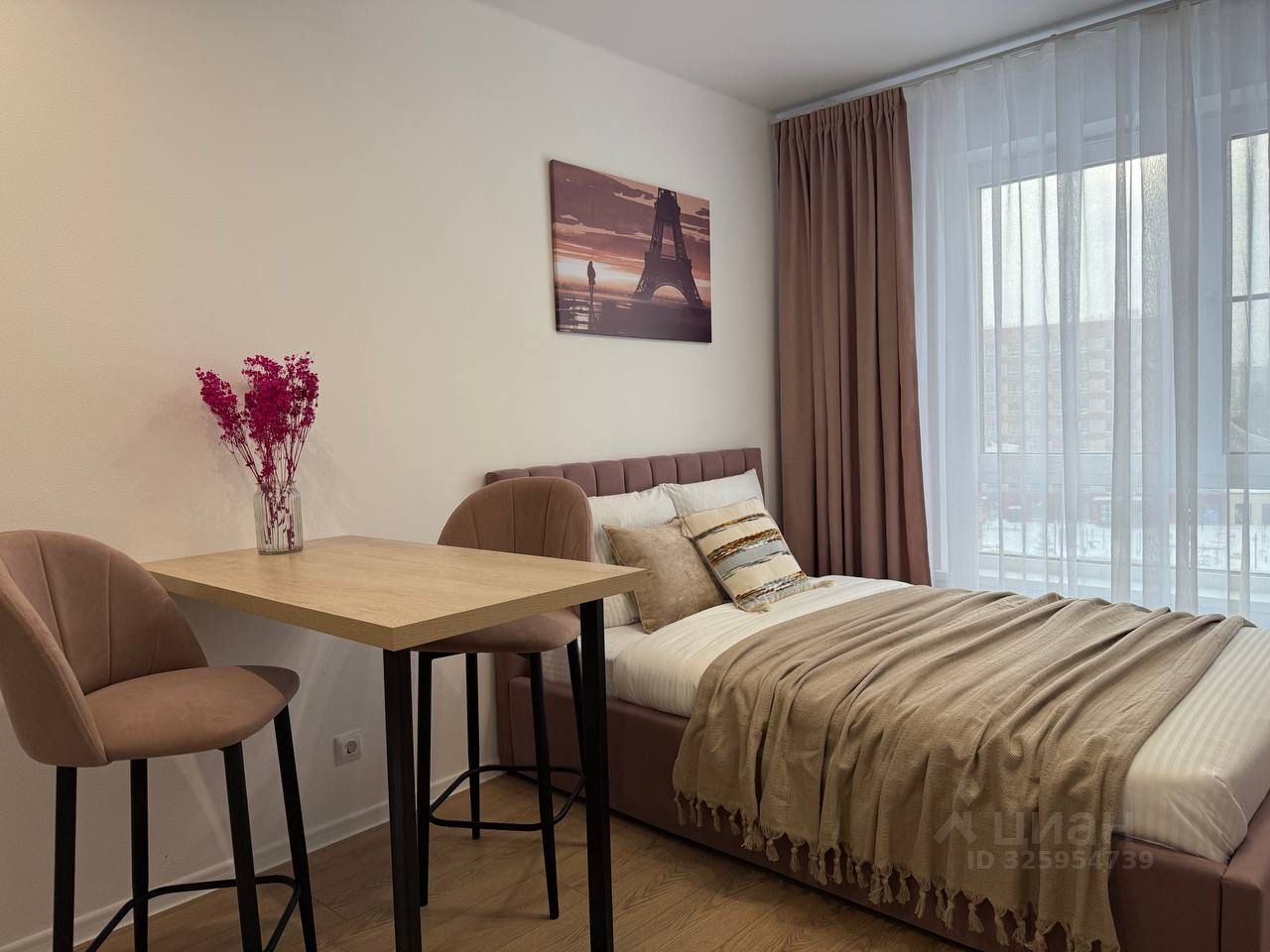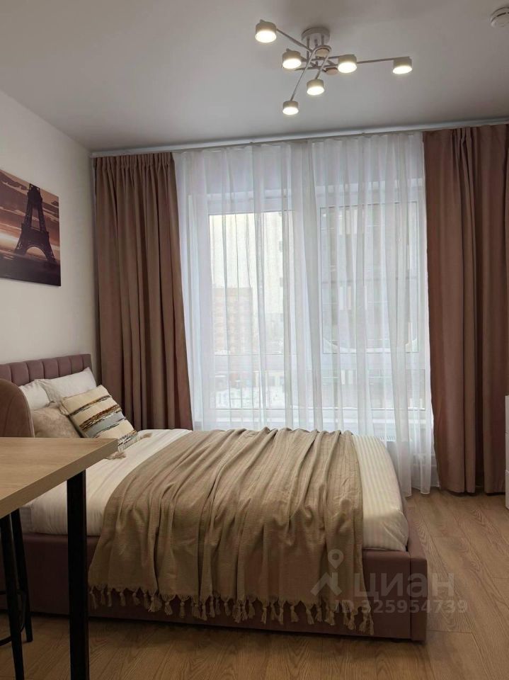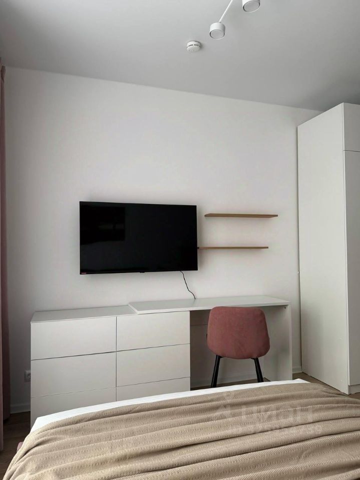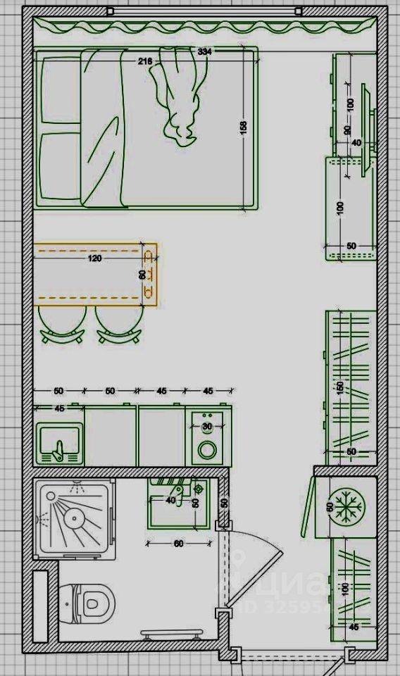 Стильная студия оборудована по максимуму : удобная кровать с подъемным меланизмом, комод,
