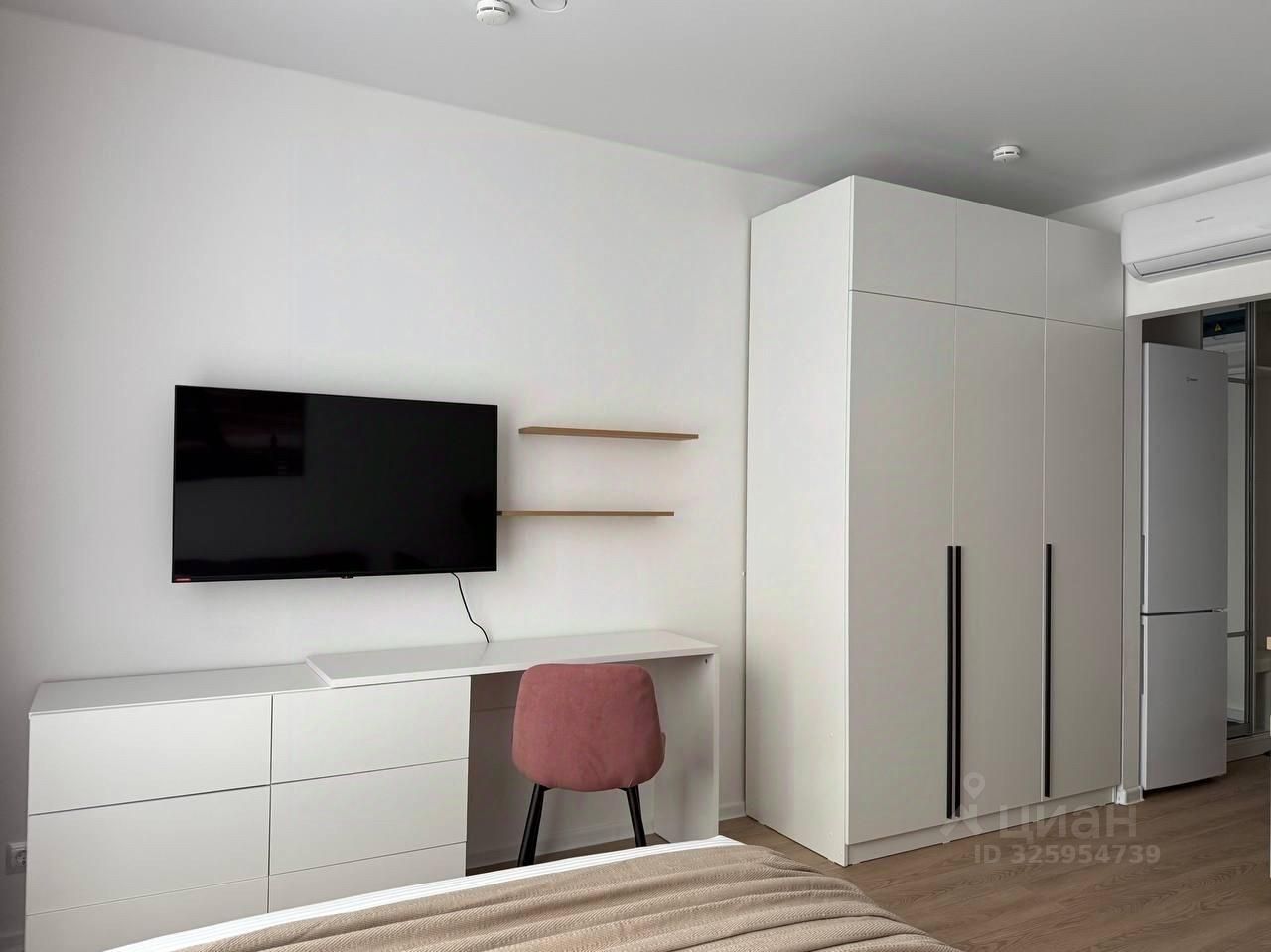 рабочий стол, телевизор, вместительный шкаф.
