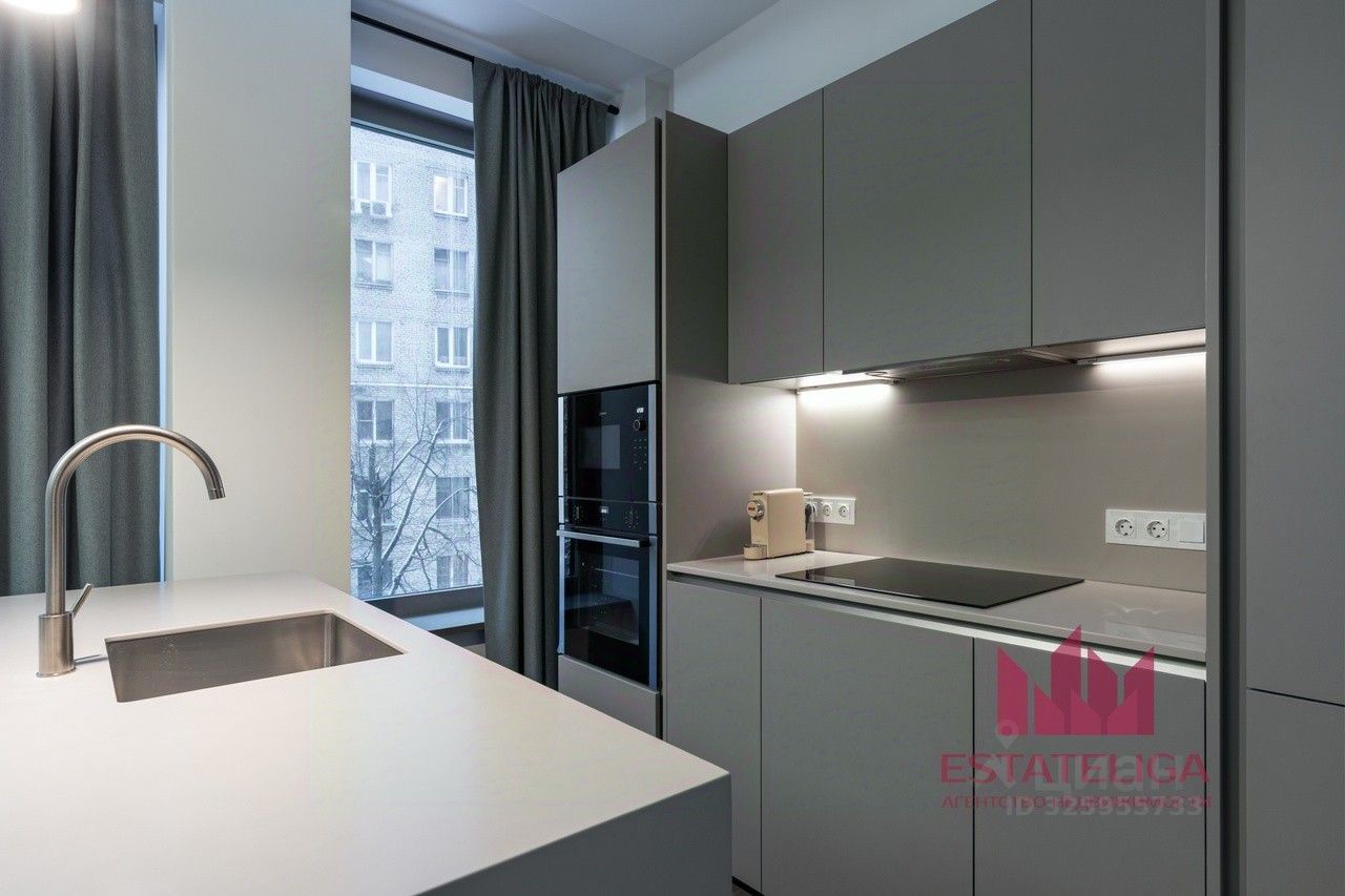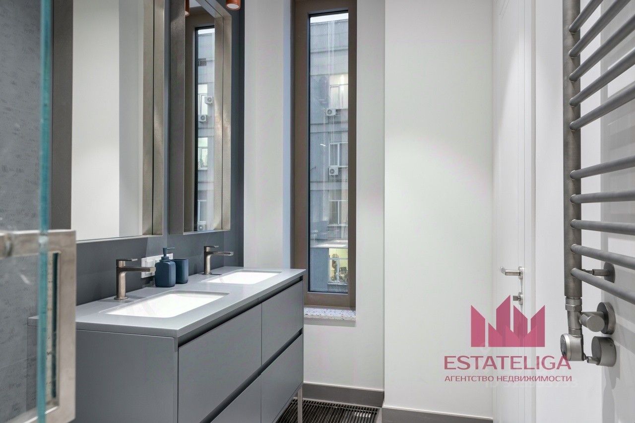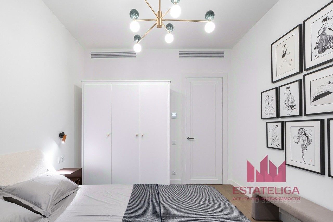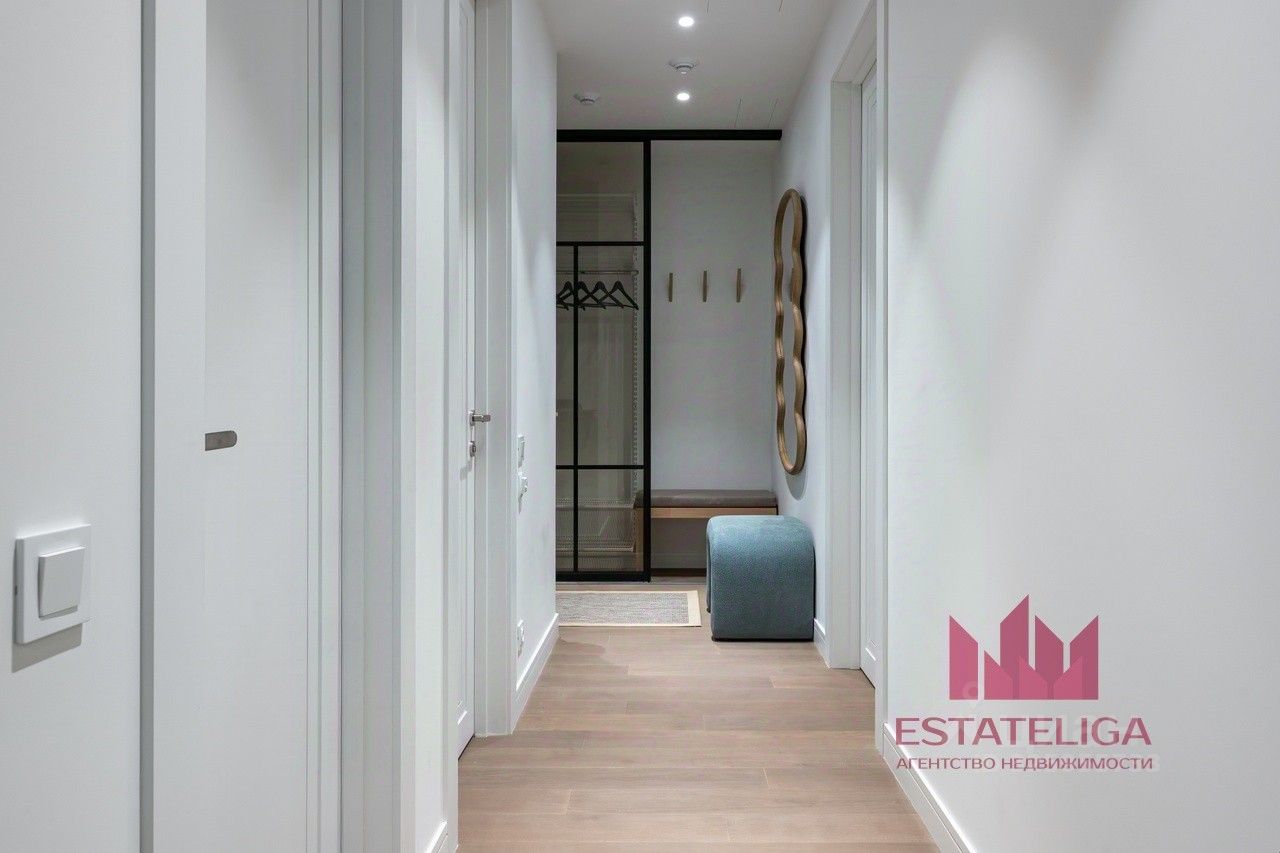 Квартира полностью меблирована и готова для комфортного проживания. На кухне установлен гарнитур с посудомоечной машиной, духовым шкафом, холодильником и кондиционером. В ванной комнате — душевая кабина. Организована гардеробная комната.