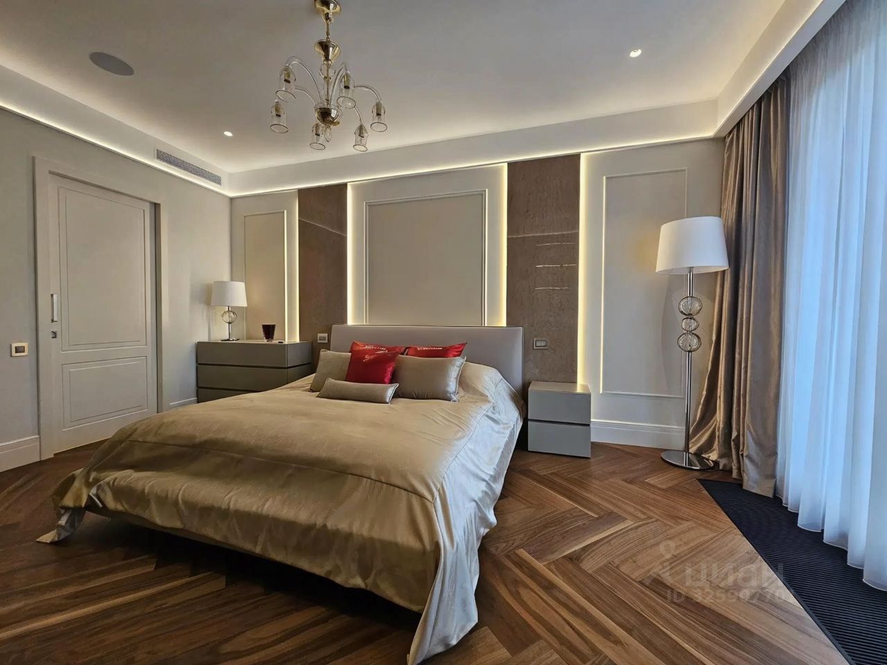 Эксклюзивные материалы и бренды: Ремонт премиум-класса и мебель из Италии. Вы оцените напольное покрытие — массивную доску от итальянского производителя Foglio, эксклюзивную парящую кровать Il Lago в мастер-спальне, мебель Tomassella и двери высочайшего качества от фабрики ADL. В зоне гостиной установлен диван Koinor Colambo (Германия) из натуральной кожи с электроприводом и системой реклайнера. Вся техника Miele, Liebherr.