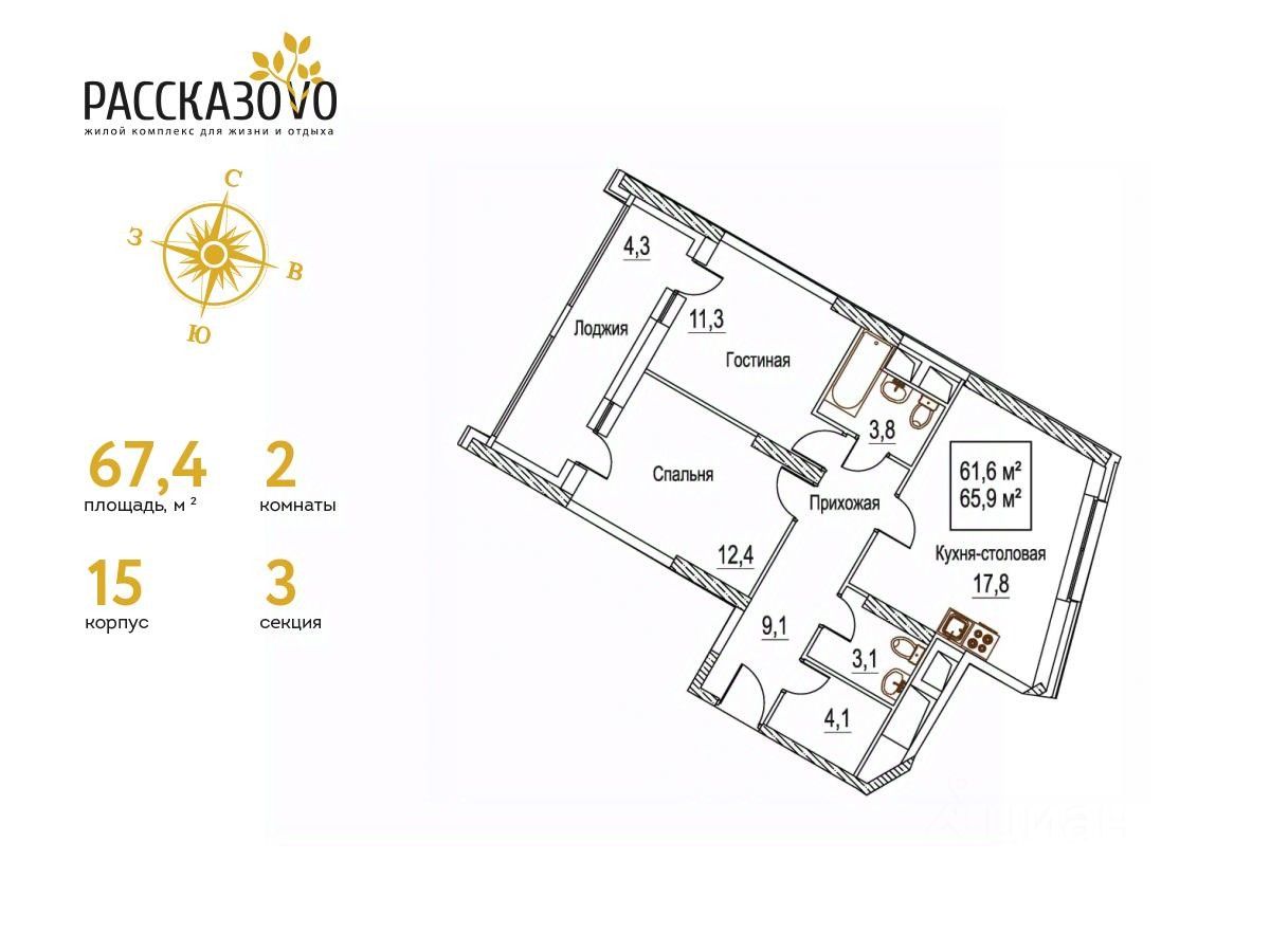 Продается 2-комнатная квартира в ЖК Рассказово на 14 этаже. Общая площадь квартиры составляет 66,2 кв.м. Квартира без отделки.