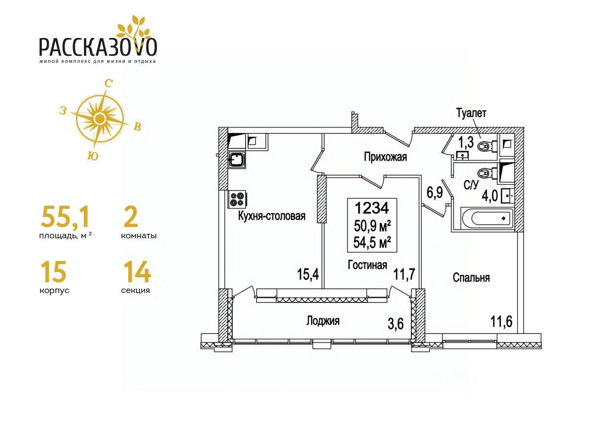 Общая площадь55,1 м2