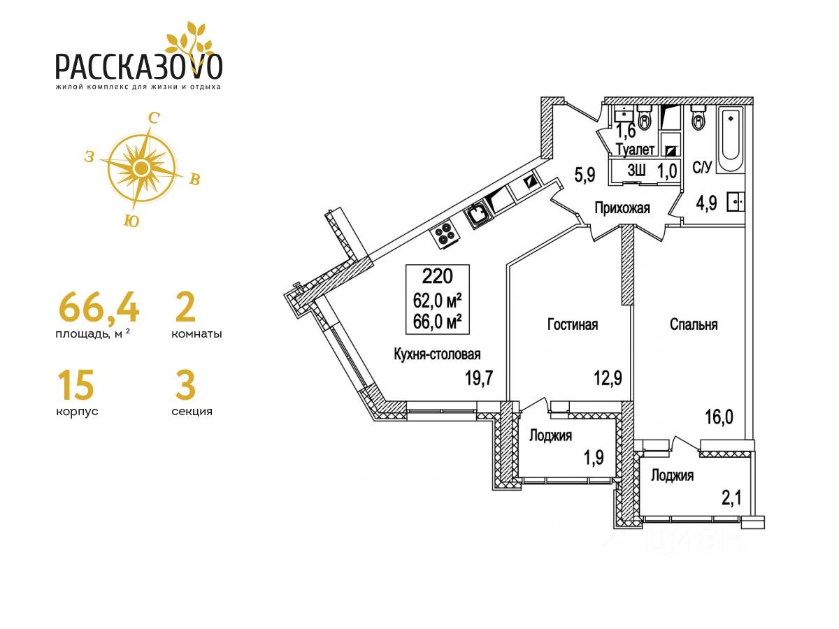 Продается 2-комнатная квартира в ЖК Рассказово на 17 этаже. Общая площадь квартиры составляет 66,4 кв.м. Квартира без отделки.